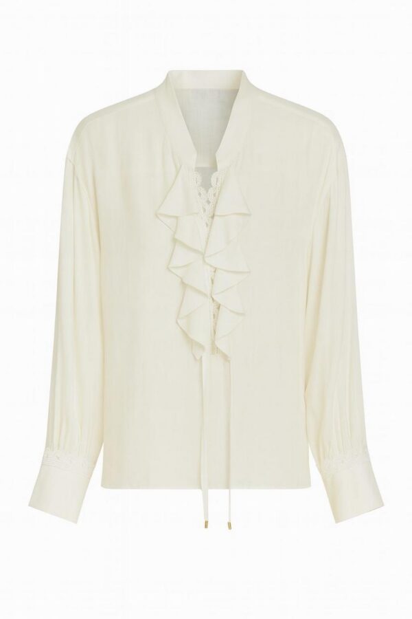 O modelo conta com detalhes em babados, que adicionam um toque feminino e romântico à peça. Com caimento solto e confortável, é ideal para compor looks sofisticados e frescos em dias mais quentes.