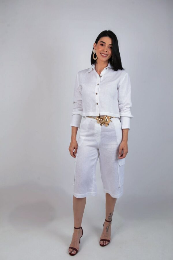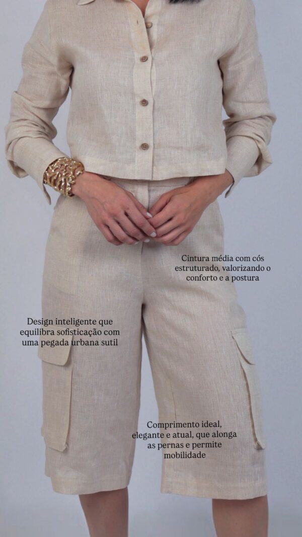Pensada para mulheres que preferem bermuda ao invés de shorts, esta peça une conforto, estilo e praticidade. Confeccionada em 100% linho, conta com bolsos laterais e bolso cargo funcional, trazendo um toque utilitário sem abrir mão da elegância natural do tecido. 72 cm