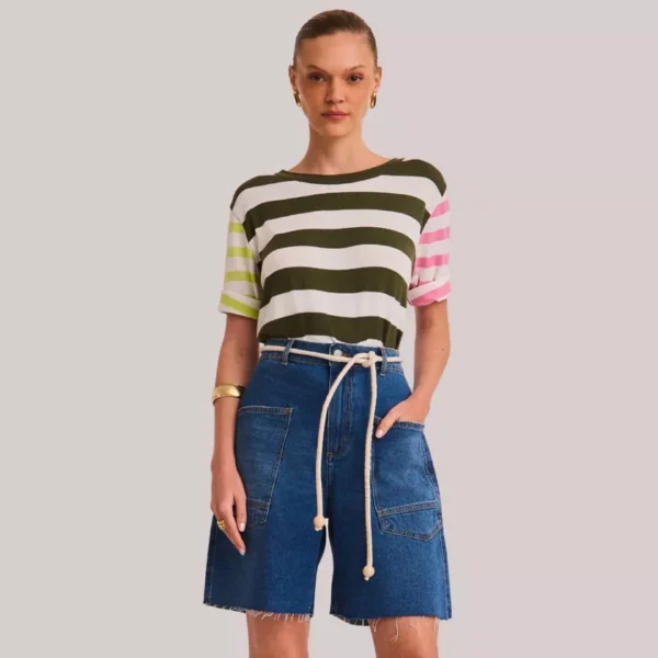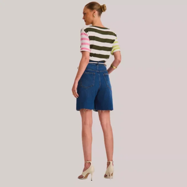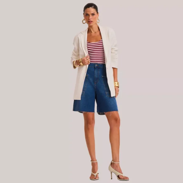 Com shape moderno e cintura média, a bermuda jeans combina lavagem stone, bolsos maxi frontais chapados e assimétricos e recortes que valorizam o visual. Fechamento com zíper frontal e botão flexível de metal personalizado garantem conforto e praticidade. Peça versátil que une sofisticação e originalidade para diversas ocasiões.
