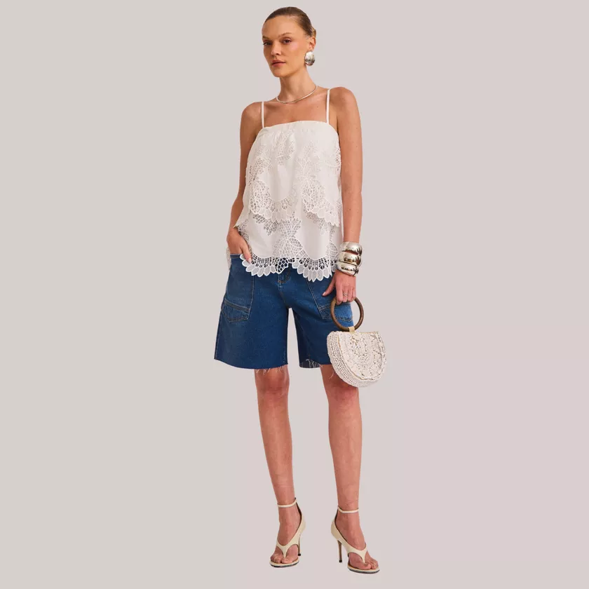 Com shape moderno e cintura média, a bermuda jeans combina lavagem stone, bolsos maxi frontais chapados e assimétricos e recortes que valorizam o visual. Fechamento com zíper frontal e botão flexível de metal personalizado garantem conforto e praticidade. Peça versátil que une sofisticação e originalidade para diversas ocasiões.
