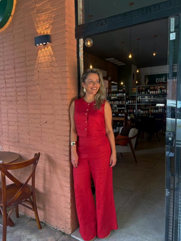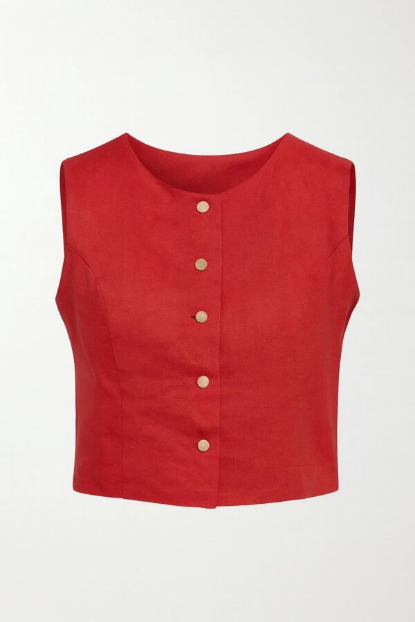 Fresca e sofisticada, esta blusa sem manga em 100% linho traz decote redondo e botões frontais com acabamento natural. Ideal para compor looks leves com um toque rústico e elegante. comprimento: 46 cm