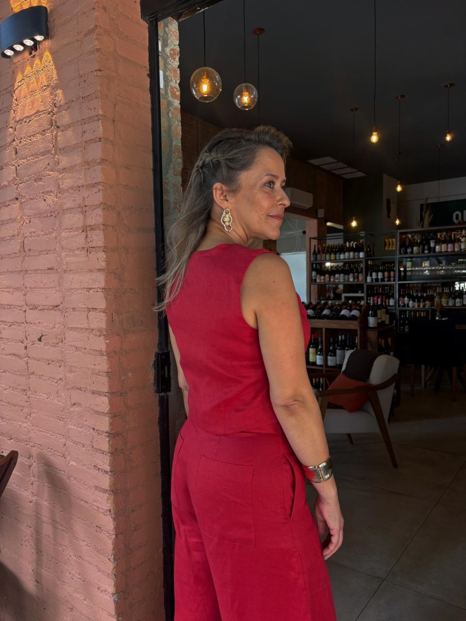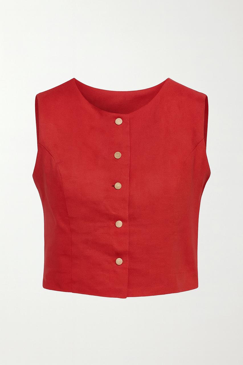 Fresca e sofisticada, esta blusa sem manga em 100% linho traz decote redondo e botões frontais com acabamento natural. Ideal para compor looks leves com um toque rústico e elegante. comprimento: 46 cm