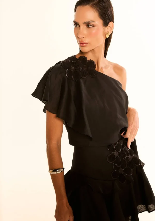 O detalhe de flor no ombro traz um toque delicado e original, perfeito para quem gosta de se destacar com estilo. Feita em linho leve e fresco, é ideal para dias quentes e combina tanto com produções casuais quanto mais elegantes. Modelo de um ombro só |Aplicação de flor em tecido no ombro |Caimento soltinho e confortável .