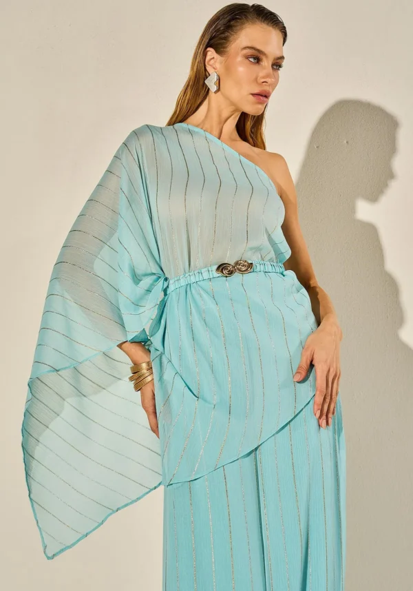 Com design de um ombro só, traz um visual assimétrico que valoriza o corpo com delicadeza e estilo. Seu tecido fluido proporciona movimento e conforto, acompanha cinto do mesmo tecido, permitindo ajustar a cintura e criar uma silhueta mais acinturada.