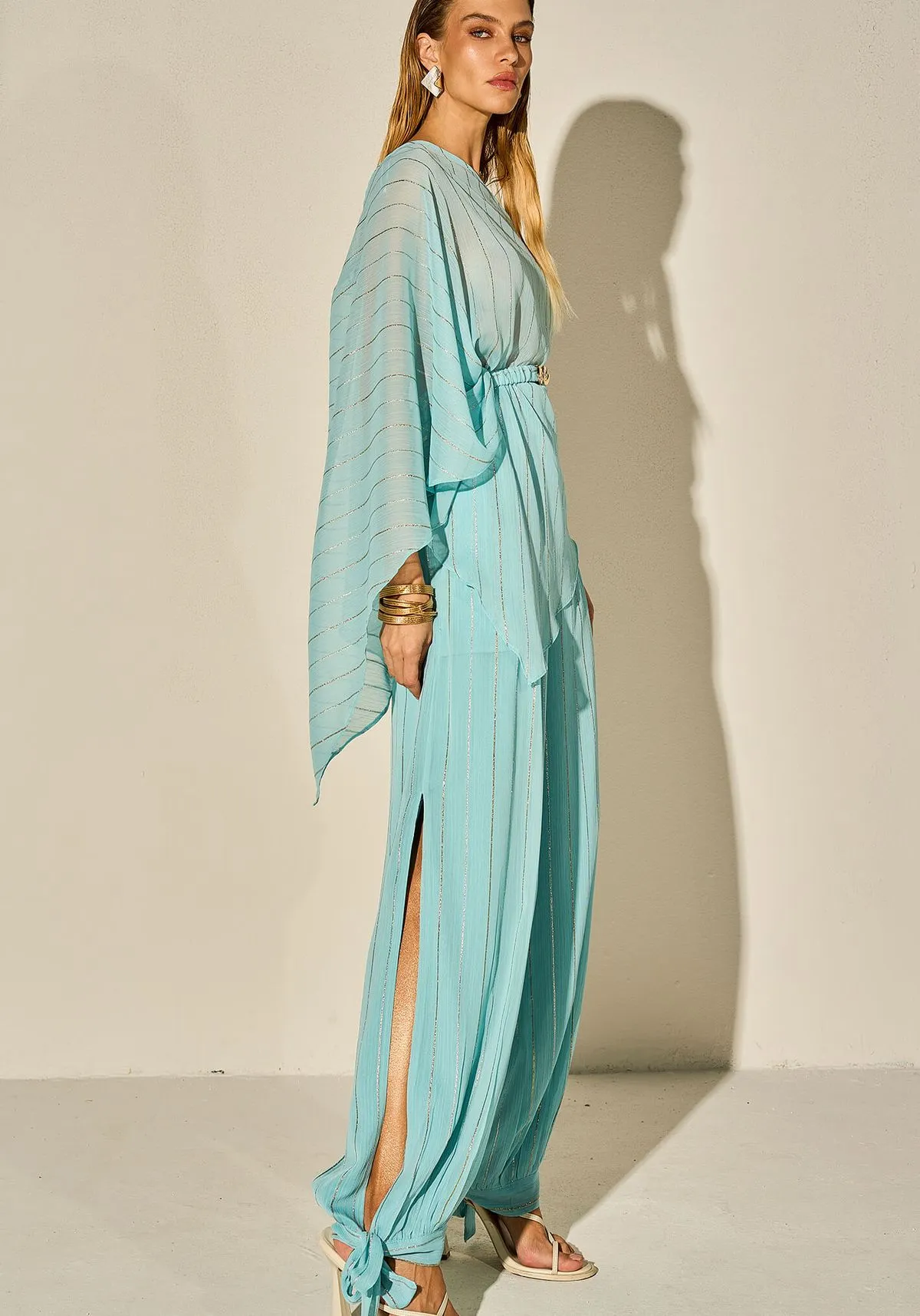 Leve abertura na perna | amarração no tornozelo | bolsos laterais.
