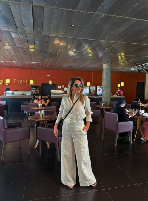 Possui bolsos laterais e traseiros, além de zíper lateral que garante um acabamento clean e moderno. Composição: 100% linho