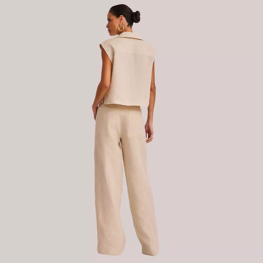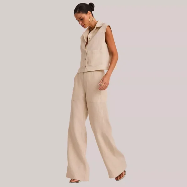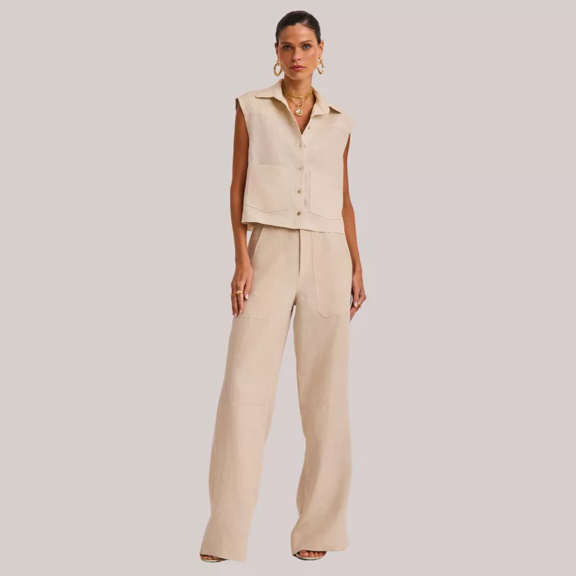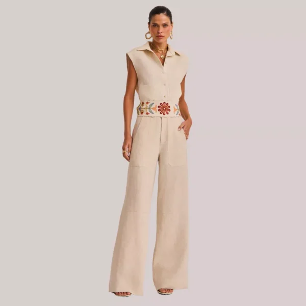 Seu caimento solto proporciona movimento e conforto, enquanto o cós alto vem destacando a silhueta de forma sutil e sofisticada. Os bolsos faca frontais adicionam funcionalidade e estilo, enquanto os bolsos amplos traseiros completam o design, os botões encapados frontais agregam um toque moderno e descontraído. O linho, material nobre e respirável, é ideal para dias mais quentes, proporcionando frescor e um toque suave sobre a pele. Versátil e atemporal, esta calça cru pode ser combinada com uma variedade de tops e acessórios, desde camisetas básicas até camisas de alfaiataria. Perfeita para compor looks que vão do casual chic ao formal, ela traz leveza e sofisticação para qualquer ocasião. Botões encapados Alfaiataria Cós alto.