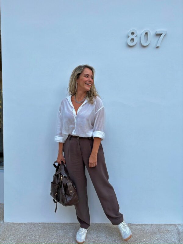A modelagem valoriza a silhueta com cintura alta e pregas sutis à frente, que conferem estrutura e movimento ao modelo. O design minimalista e sofisticado. Cós reto com fechamento frontal, pernas de corte reto ou levemente afunilado para um visual alongado. A cor marrom traz versatilidade, funcionando tanto em looks do dia-a-dia quanto em combinações mais sociais.