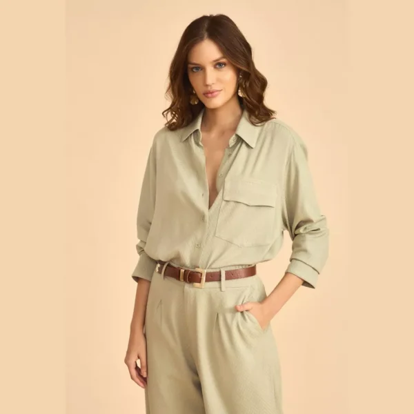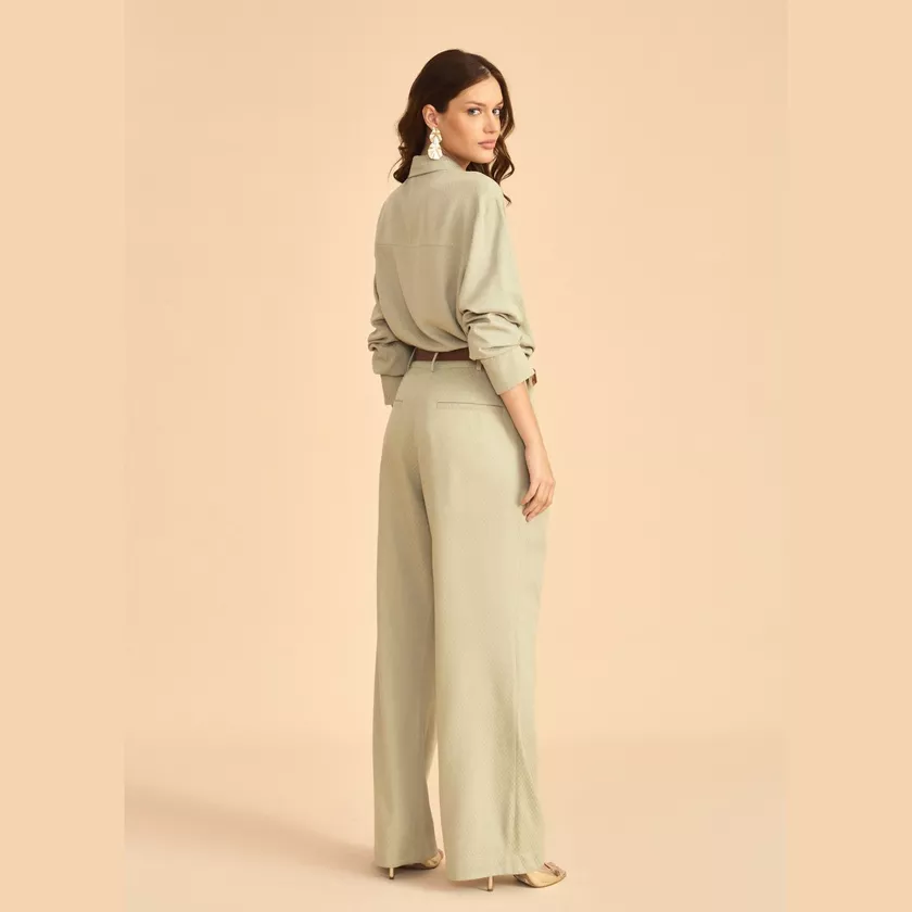 A camisa possui mangas longas com botão nos punhos, gola com lapela e fechamento frontal por botões, garantindo um visual impecável e confortável. O bolso lateral com lapela adiciona um toque funcional e estiloso à peça, destacando sua atenção aos detalhes. A calça, de caimento solto e cós alto com passantes, apresenta um design que valoriza a silhueta sem abrir mão do conforto. O fechamento por zíper e colchete assegura um ajuste perfeito, enquanto os bolsos faca frontais e as leves pregas criam um efeito único e sofisticado. Ideal para diversas ocasiões, o conjunto permite composições que transitam entre o casual chic e o elegante, sempre com um toque de exclusividade. Conjunto de duas peças Jacquard Camisa manga longa Calça com caimento solto Zíper e colchete