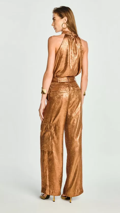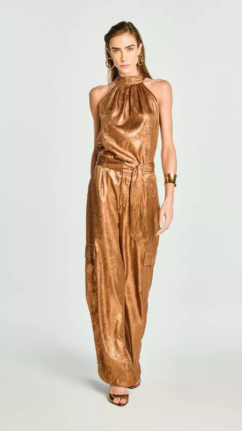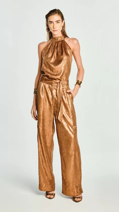 A calça pantalona possui cós com colchete interno e vista com zíper, pregas frontais, bolso faca, bolso embutido costas e passantes com cinto faixa que complementa o visual. O look pode ser usado de forma elegante em look coordenado, ou desmembrada, criando diferentes produções — desde composições sofisticadas até propostas mais casuais e modernas . Conjunto Feminino Brilho Calça Pantalona Gola Alta 100% Poliéster|