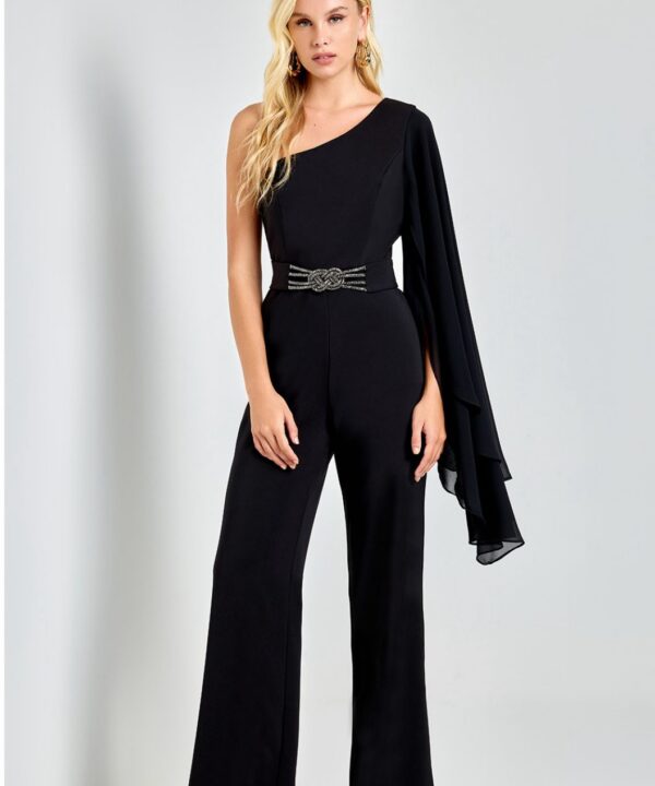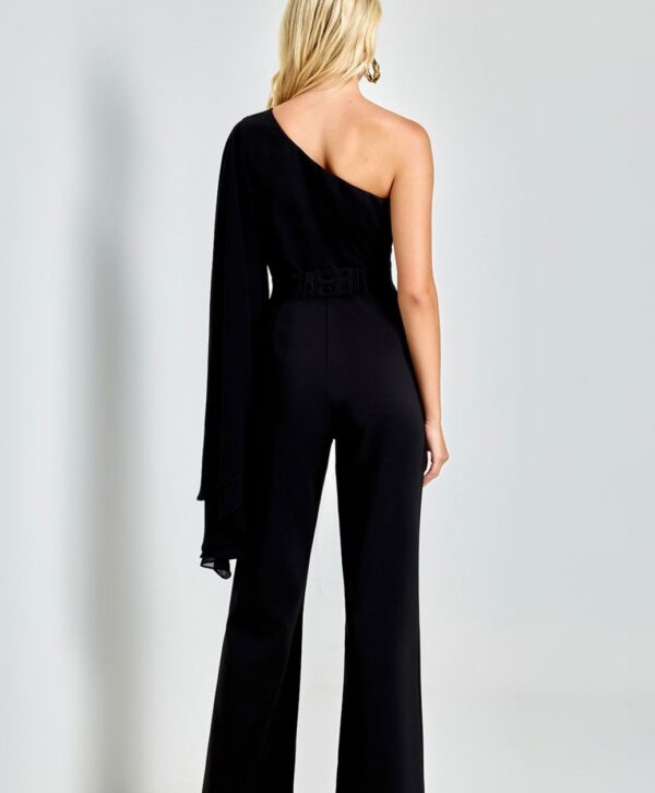 Este macacão de crepe estruturado possui ombro único com chiffon na manga ampla. O design ajustado ao corpo até a cintura
