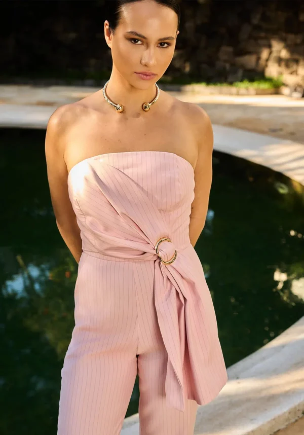 Macacão listrado com design moderno que destaca os ombros à mostra, trazendo um toque de charme e frescor ao visual. As listras verticais alongam a silhueta, enquanto o caimento fluido valoriza a liberdade de movimento.