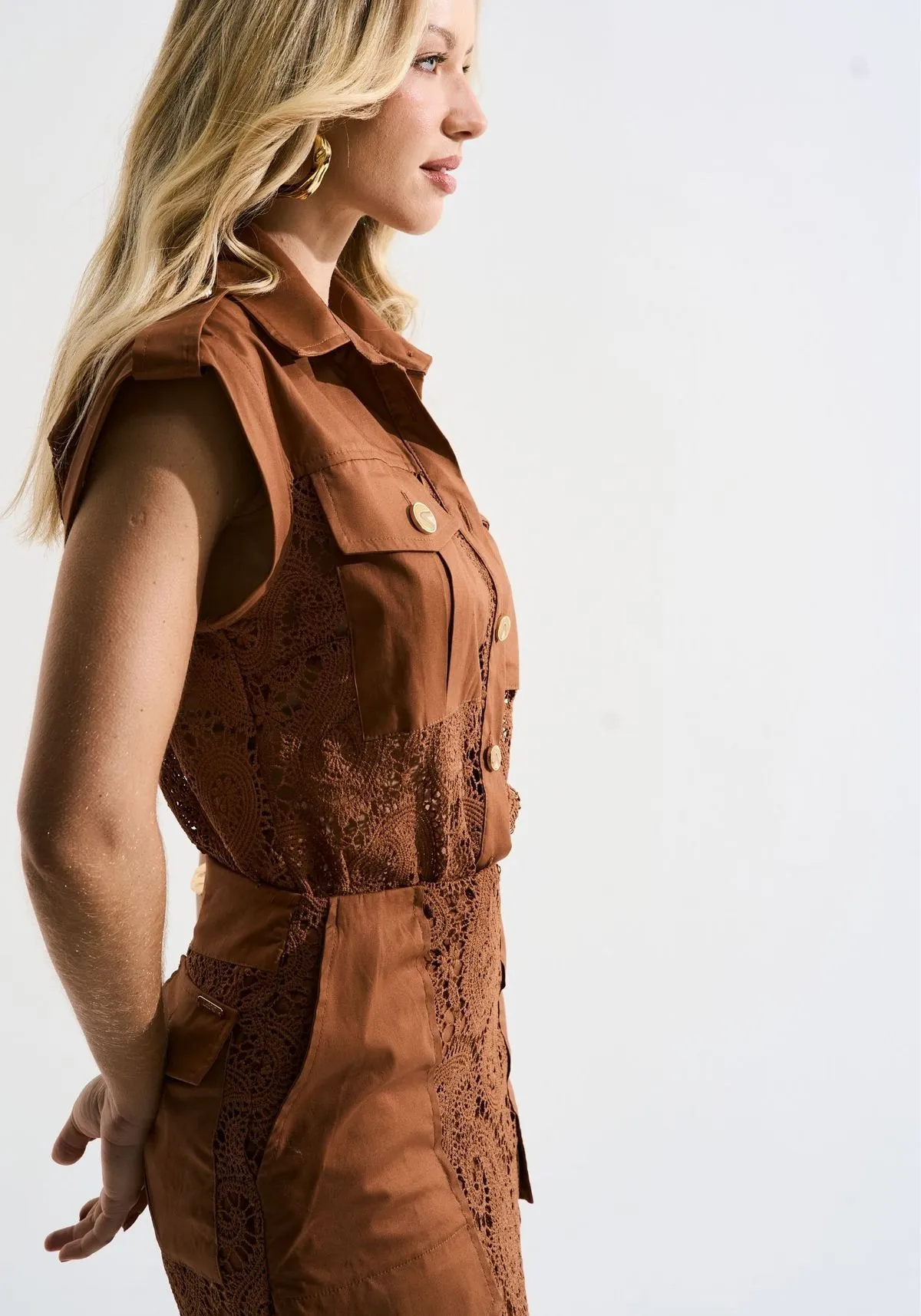 Com bolsos tanto na frente quanto atrás, une charme e funcionalidade em uma peça única. O grande destaque está no mesclado harmonioso entre o guipir delicado e o tecido liso, criando um contraste sofisticado que valoriza o design e traz leveza ao visual.