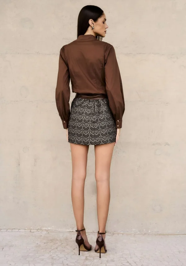 A saia curta em jacquard traz sofisticação e textura ao visual. Com fechamento por zíper nas costas, garante um ajuste elegante e discreto. Uma peça versátil, perfeita para composições que vão do clássico ao moderno com charme e personalidade.