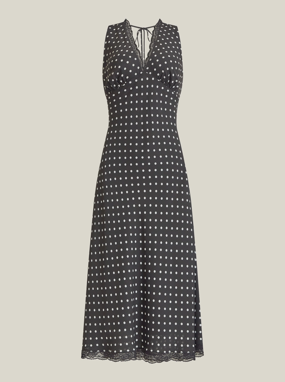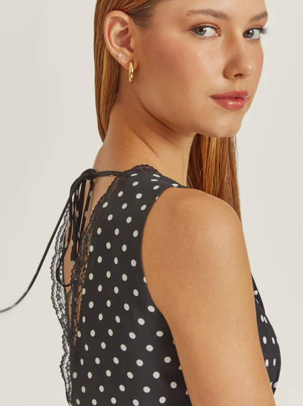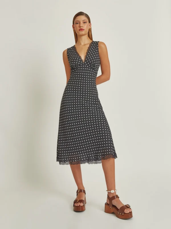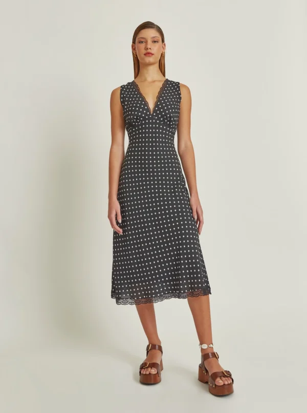Possui decote em V com aplicação de renda, recorte no busto e modelagem evasê com comprimento midi, que valoriza a silhueta com delicadeza. Com zíper invisível nas costas e detalhe de amarração.