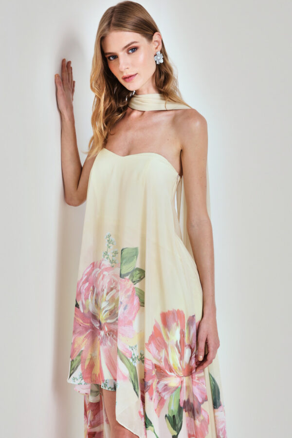 Vestido longo confeccionado em chiffon com estampa floral delicada em tons de rosa e verde sobre fundo azul acinzentado. O modelo possui decote sem alça com acabamento reto e estrutura leve que garante sustentação. O caimento é fluido e assimétrico, com comprimento mullet que valoriza as pernas na parte frontal e forma um efeito de cauda suave atrás. A estampa localizada traz um toque artístico e romântico. A parte de trás mantém o mesmo corte reto no busto, com detalhe de alças finas em tecido transparente que caem delicadamente sobre os ombros até a altura do chão, simulando uma capa esvoaçante. A estampa floral segue posicionada na parte inferior da peça, trazendo continuidade visual e harmonia ao look. Ideal para eventos ao ar livre e produções com pegada fresh e sofisticada.