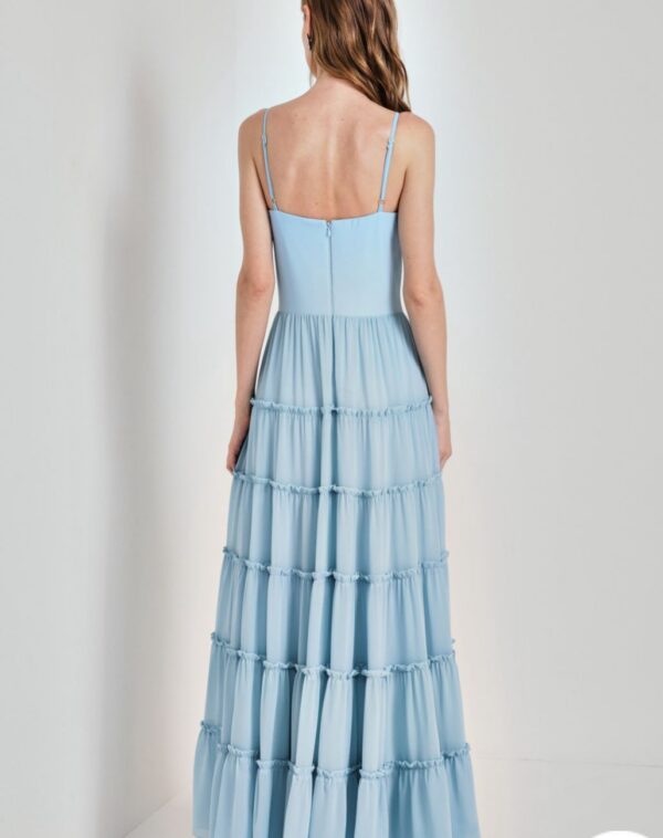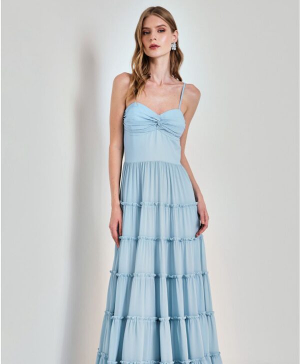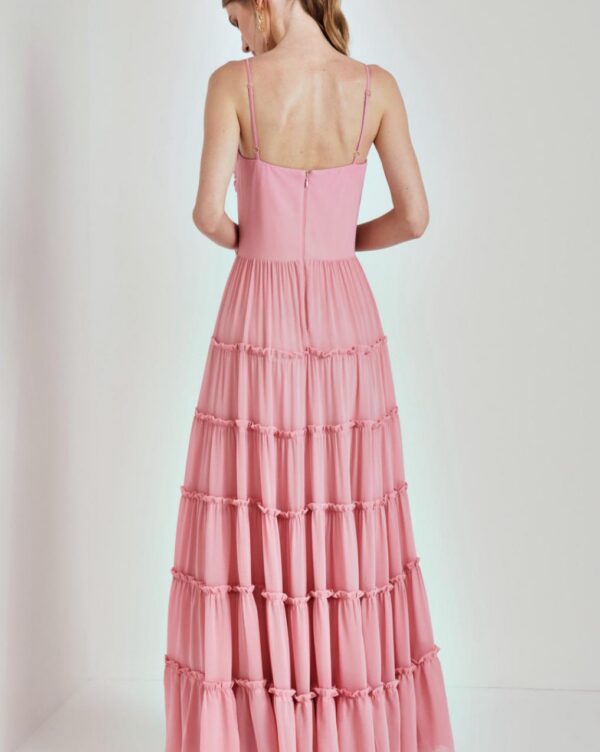 proporcionando um ajuste sutil ao corpo. A cintura marcada valoriza a silhueta, enquanto a saia em camadas apresenta babados horizontais criando volume