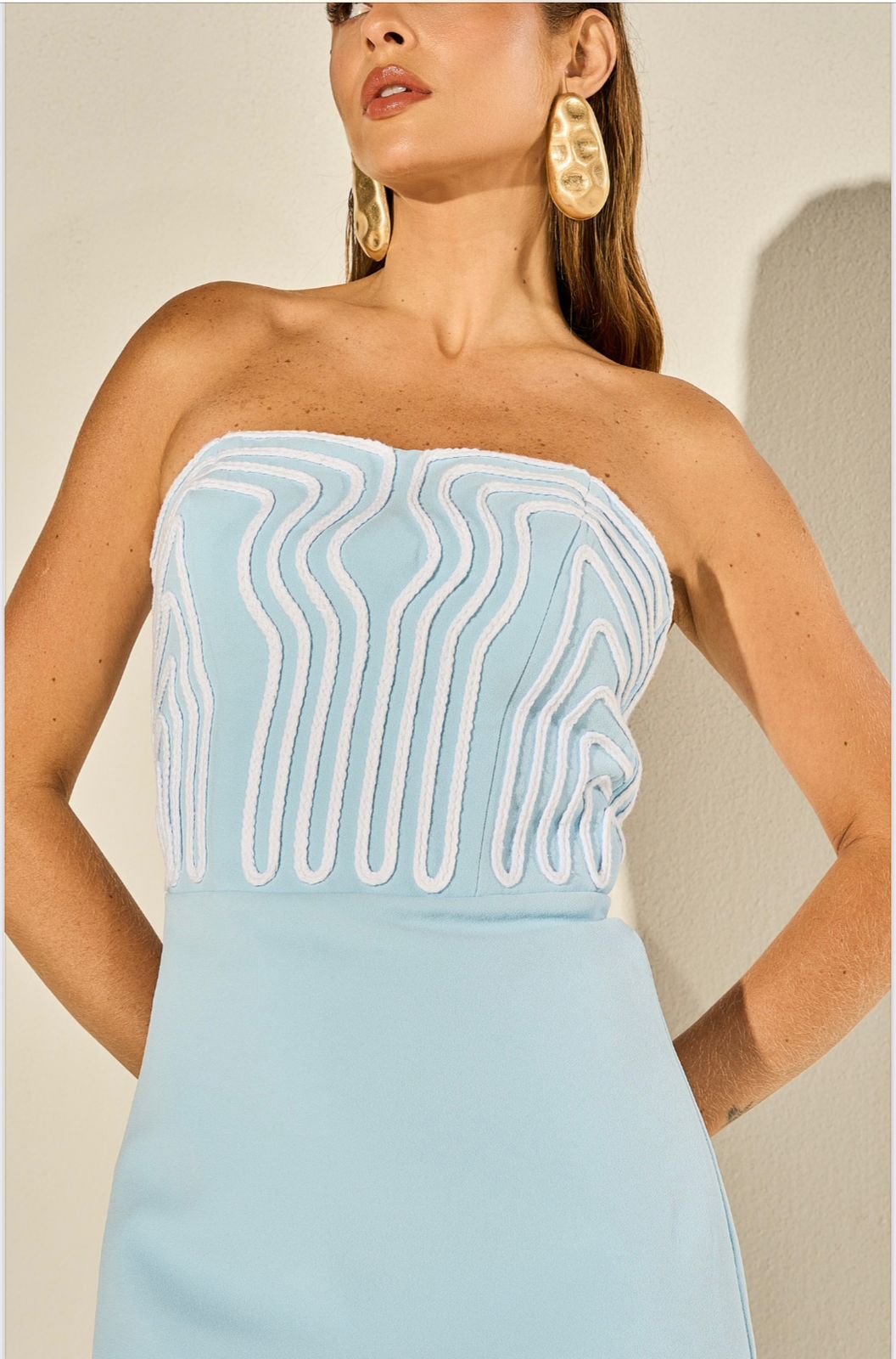 Nas costas, o zíper de metal dourado adiciona um toque contemporâneo. O destaque fica para o bordado frontal em desenho de ondas, que adiciona movimento e delicadeza à peça.