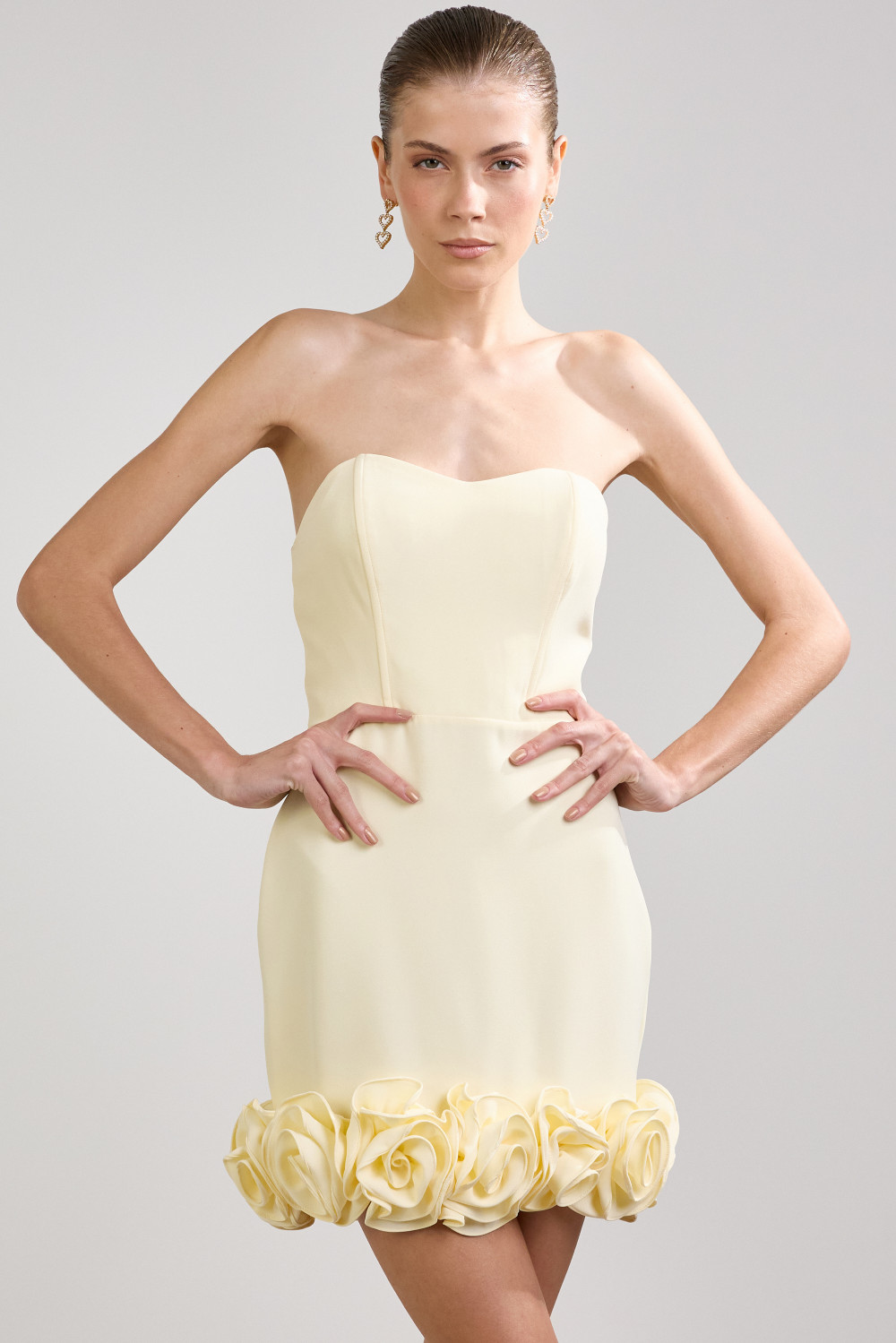 Moderno, romântico e cheio de charme, este vestido curto tomara que caia é perfeito para quem busca um look elegante e feminino. Sua modelagem é ajustada ao corpo, valorizando a silhueta, com decote coração que traz delicadeza e sofisticação. O grande destaque da peça está na barra com aplicação de flores em tecido, que conferem um toque romântico, criativo e diferenciado, tornando o visual único e memorável. Na parte de trás, o vestido possui fechamento com zíper invisível, garantindo praticidade e acabamento refinado. O design tomara que caia proporciona um colo livre, perfeito para valorizar acessórios e criar produções elegantes.