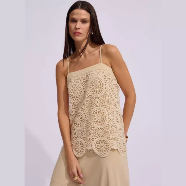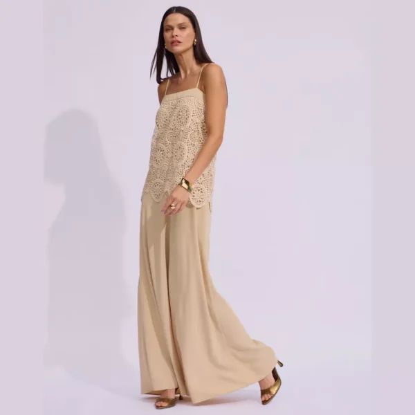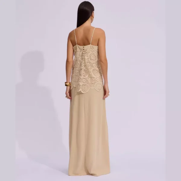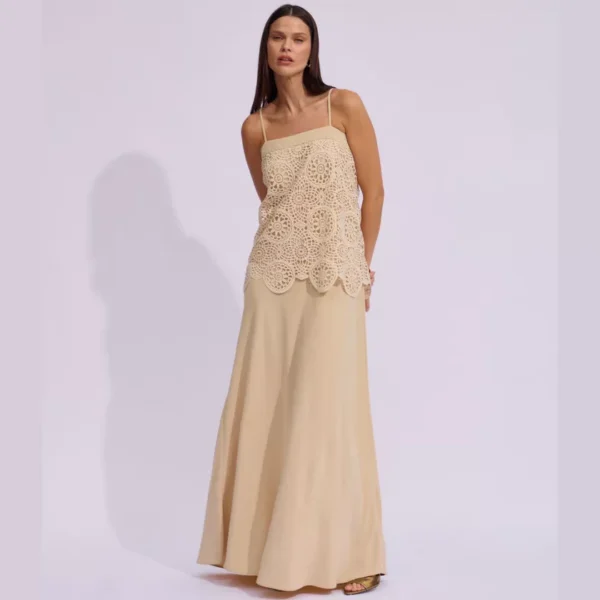 Com comprimento longo, caimento solto e fluido, a peça se destaca pelo corte em viés e o decote reto com detalhe de sobreposição da renda croche revelando sutilmente a pele de forma elegante. O fechamento nas costas possui zíper invisível com delicados botões forrados que reforça o cuidado nos acabamentos . Para finalizar a produção com equilíbrio e definição, o look é perfeito para ocasiões especiais ou para os dias em que se deseja vestir com modernidade. -Modelagem em viés -Detalhe em renda crochê.