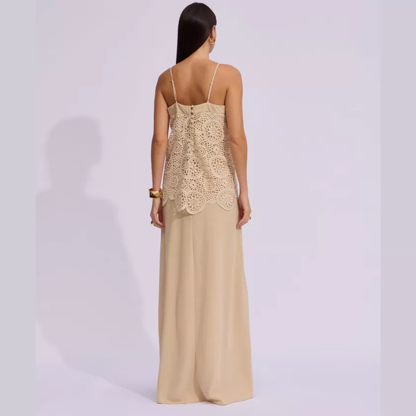 Vestido Longo crepe detalhe croche Daniela. Cheio de bossa e contemporâneo, o vestido é confeccionado em alfaiataria leve proporcionando um caimento impecável.