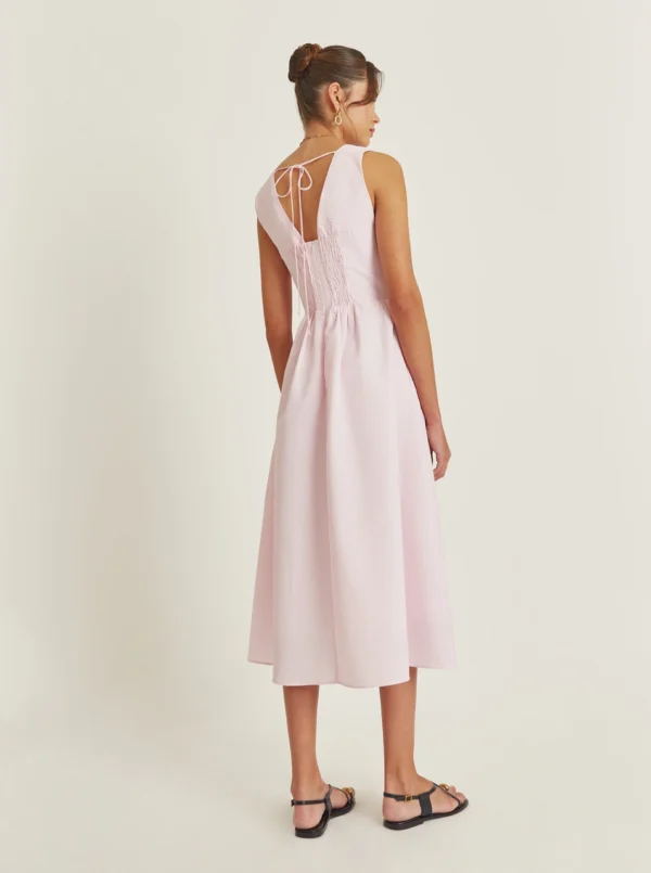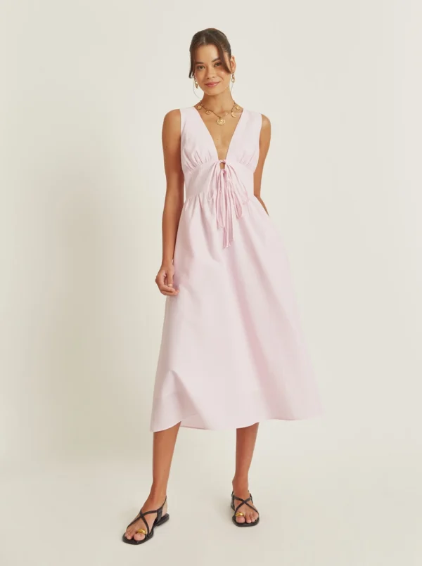 O modelo possui decote profundo com amarração frontal e recorte abaixo do busto, que valoriza a silhueta de forma delicada. A parte posterior conta com decote nas costas e fechamento por zíper invisível. Seu comprimento é midi, com alças largas e saia ampla com bolsos discretos.