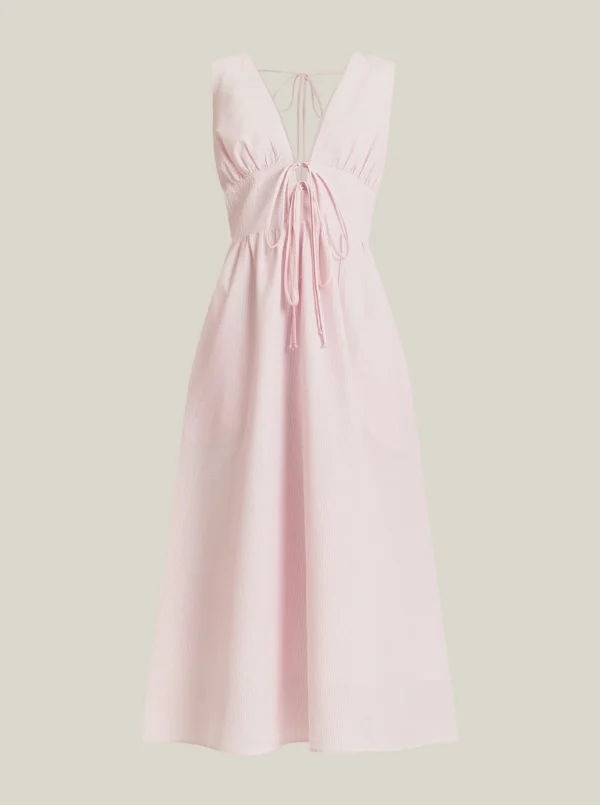 O Vestido Fátima é confeccionado em cambraia listrada, tecido leve, respirável e com caimento suave.