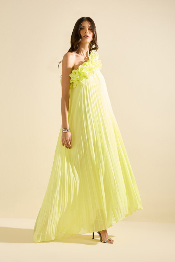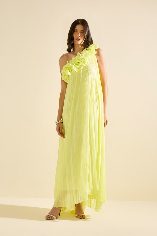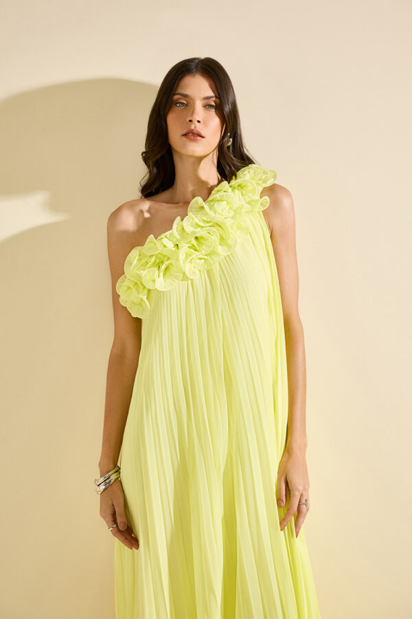 Nas costas, o design segue o estilo de um ombro só, com o detalhe floral em continuidade, criando um visual impactante e harmonioso. O plissado dá movimento ao look, enquanto o caimento amplo valoriza todos os tipos de corpo. O acabamento é delicado e sem fechos aparentes, reforçando o visual clean e refinado da peça.