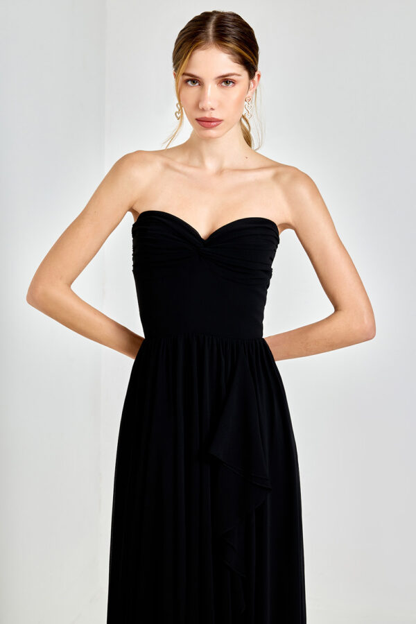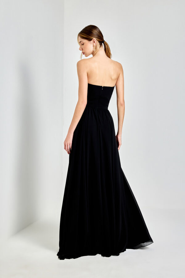 Vestido longo de chiffon com busto coração com torção. O modelo possui modelagem acinturada e saia ampla com babados verticais que se abrem em uma fenda. Perfeito para casamentos, festas e diversos outros momentos especiais.