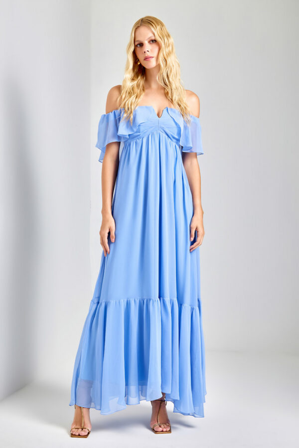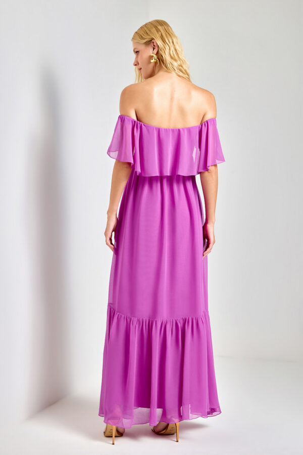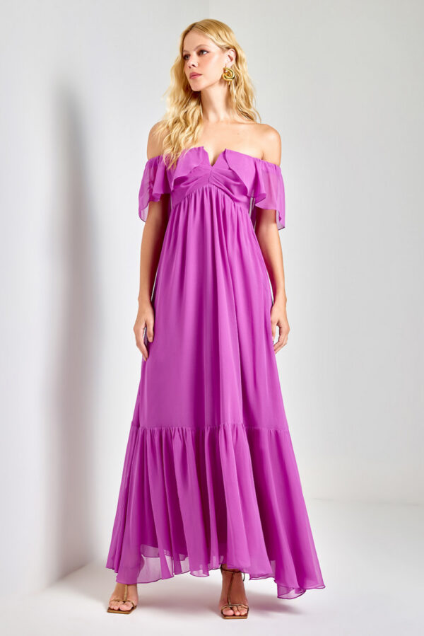 Este vestido de chiffon apresenta uma modelagem fluida e assimétrica, com um ombro só e capa embutida que adiciona leveza ao design.