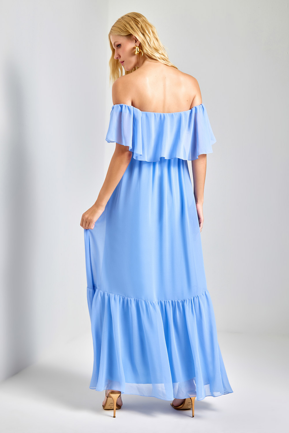 Este vestido de chiffon apresenta uma modelagem fluida e assimétrica, com um ombro só e capa embutida que adiciona leveza ao design.