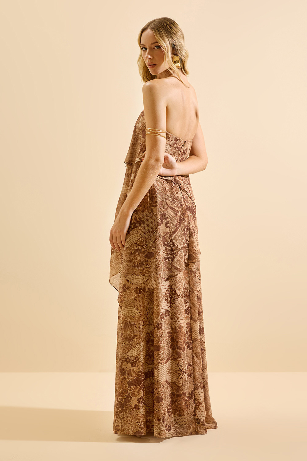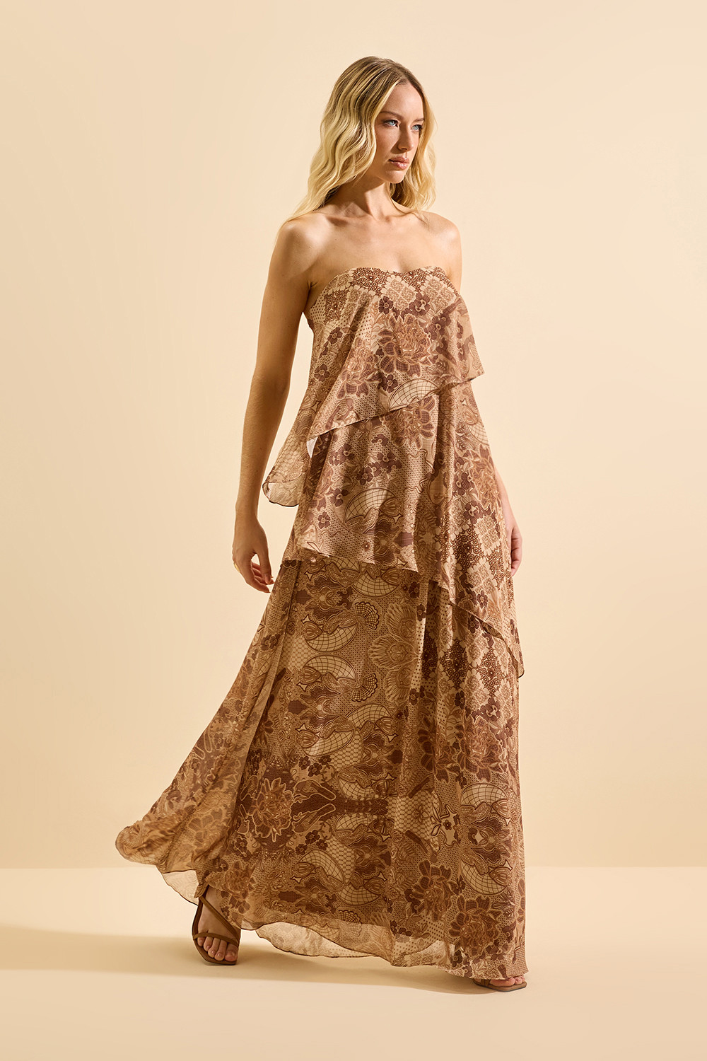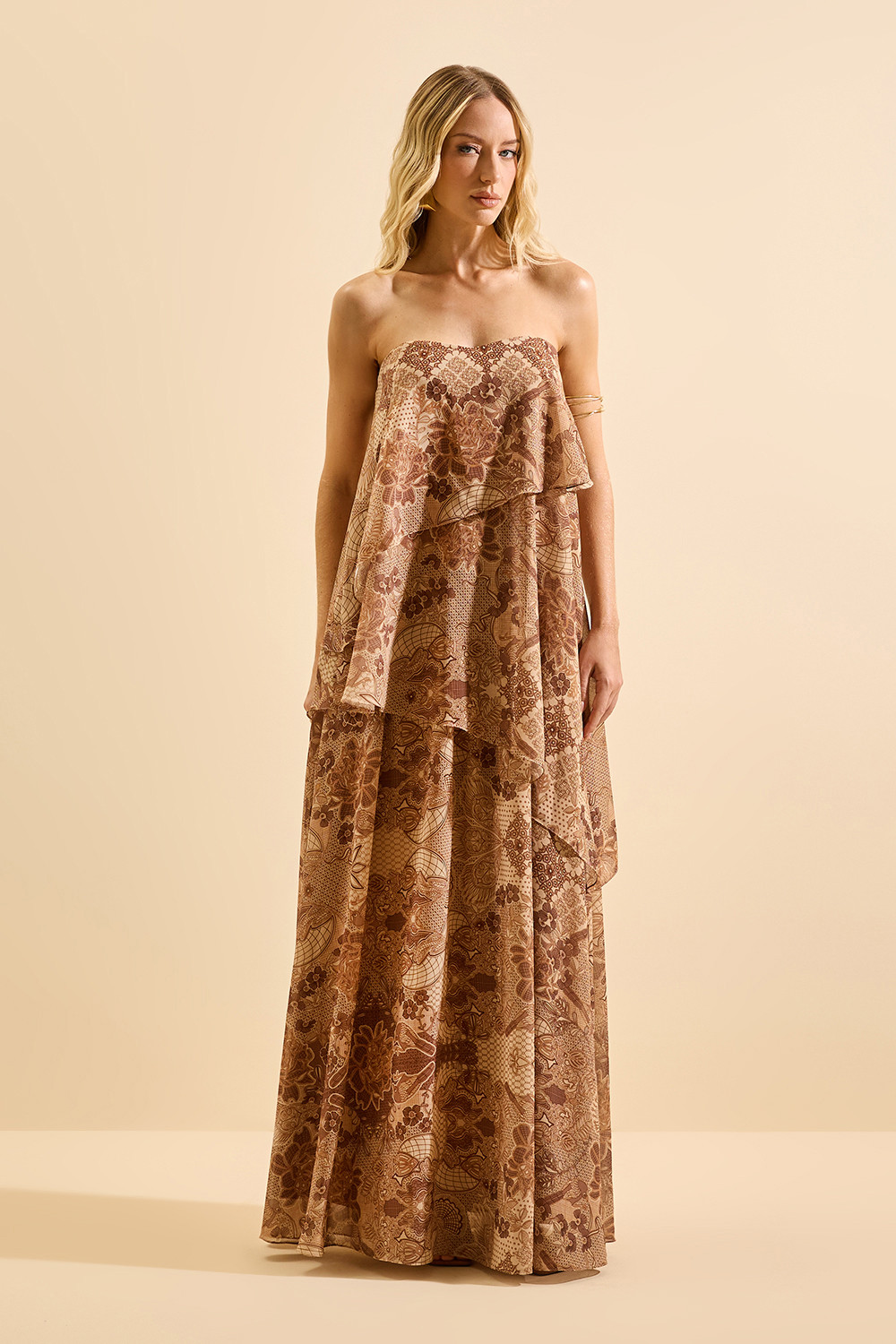 Este vestido longo tomara-que-caia é a escolha perfeita para quem busca leveza e elegância. Confeccionado em tecido fluido com estampa floral em tons terrosos, ele apresenta camadas assimétricas que caem suavemente pelo corpo, criando movimento e um visual sofisticado. O fechamento nas costas com zíper invisível garante praticidade sem comprometer a estética clean da peça.