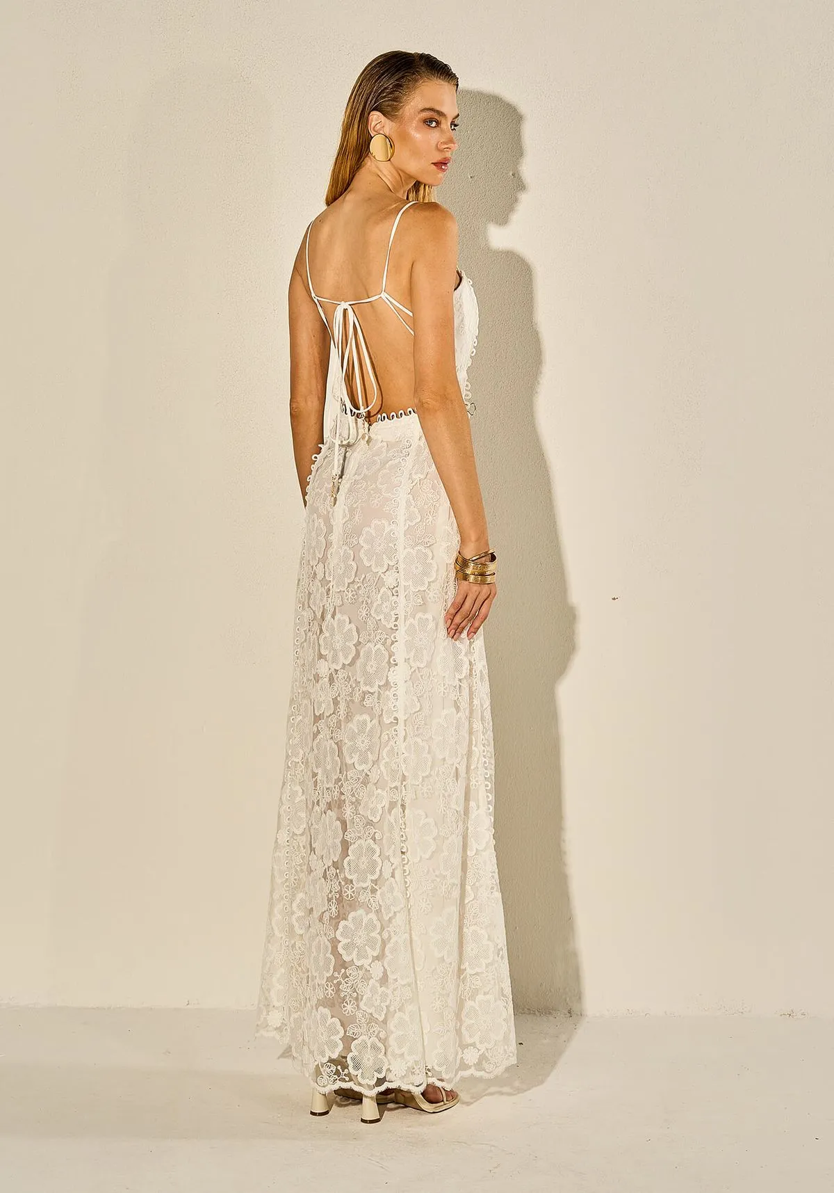 O vestido longo Eva em guipir é a definição de elegância e delicadeza. Confeccionado em renda guipir, possui forro em todo o comprimento, garantindo conforto e um caimento perfeito.