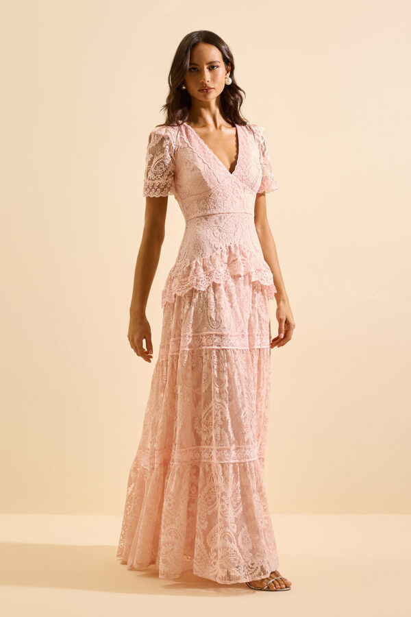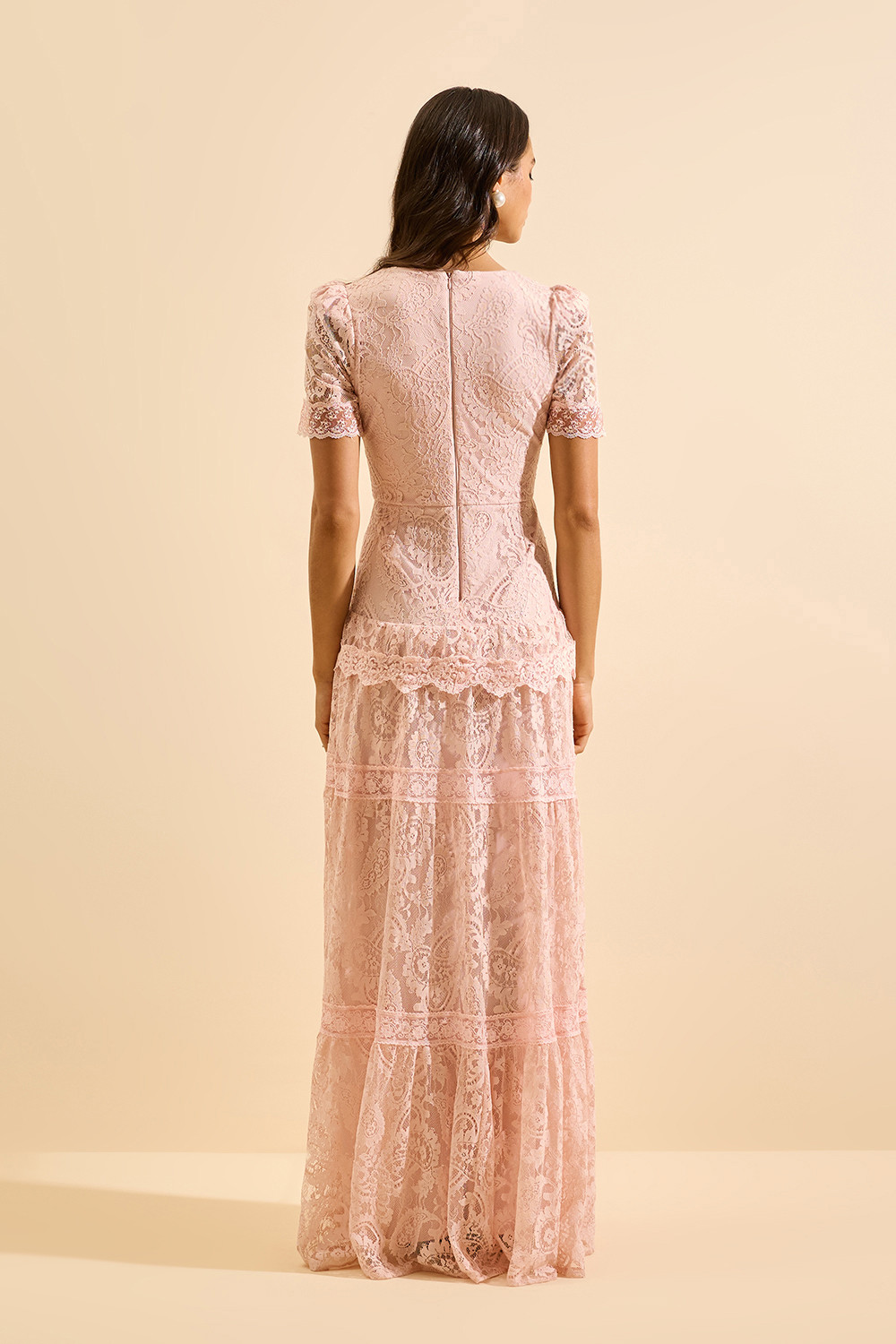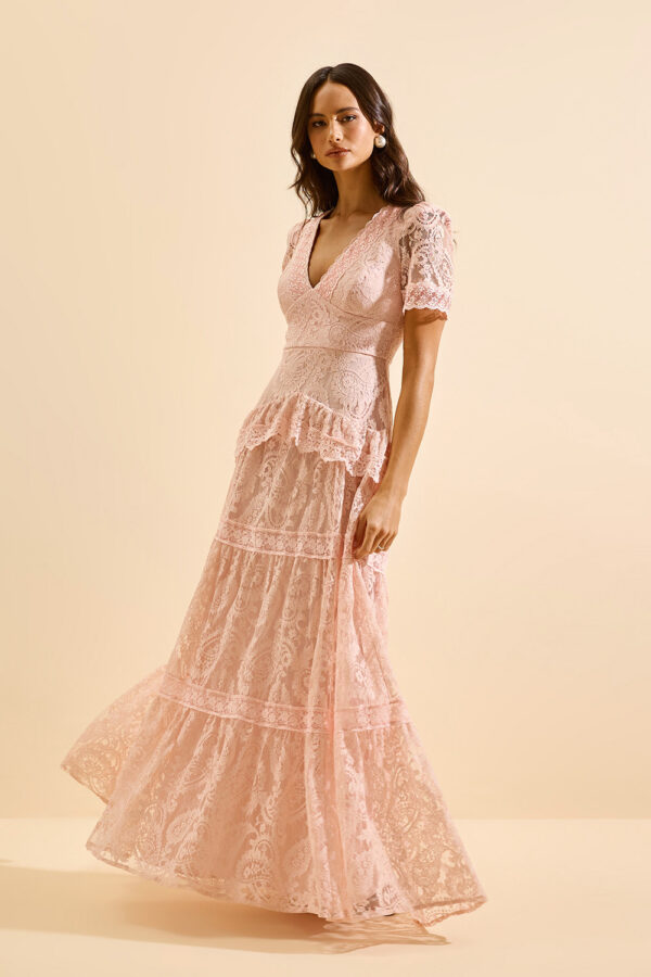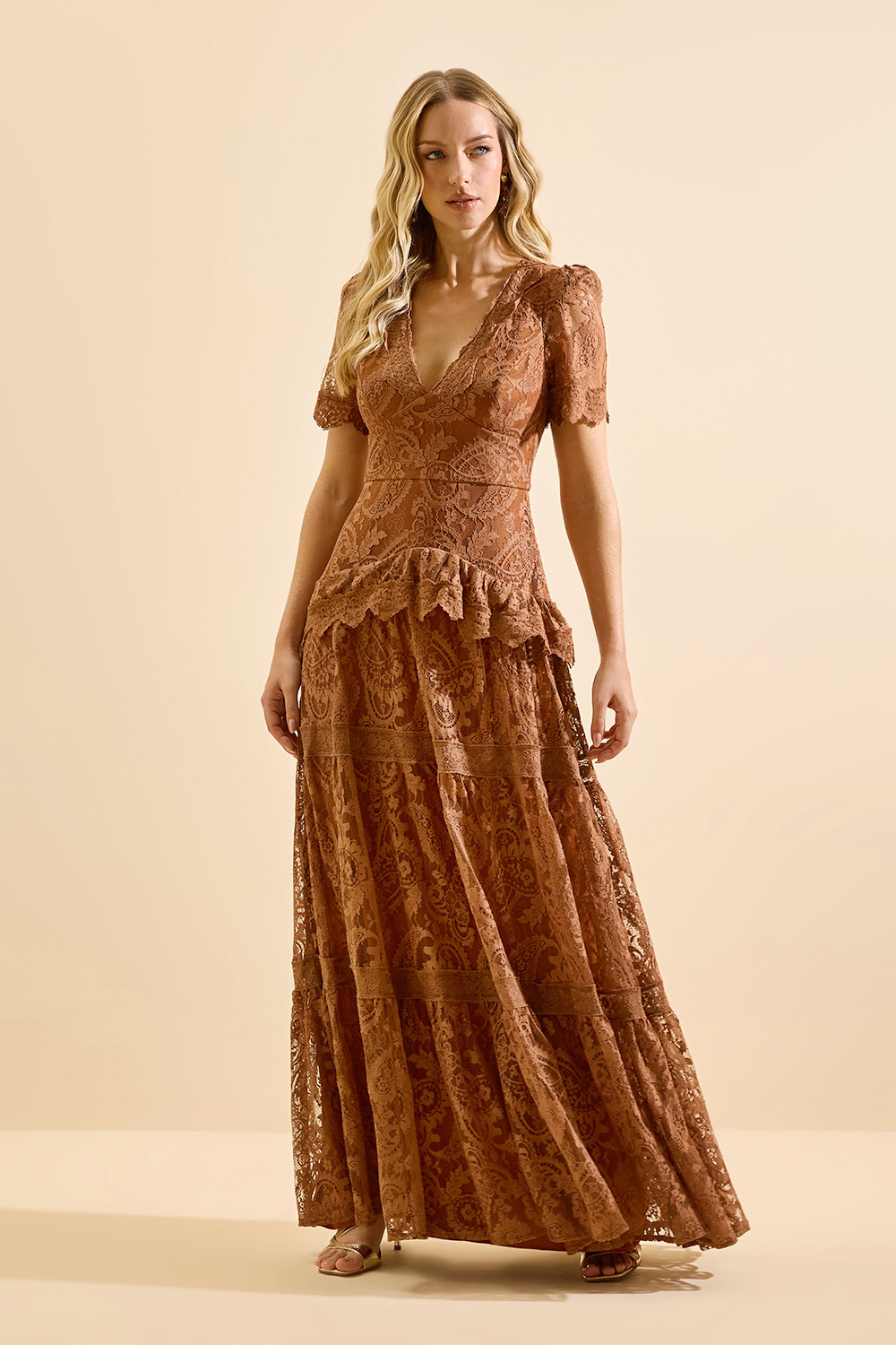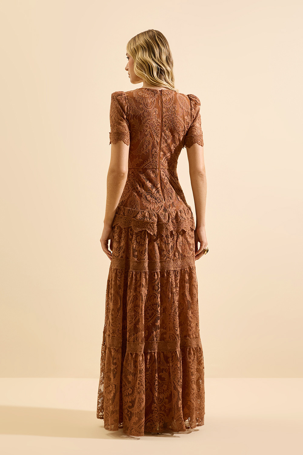 Saia longa fluida, composta por recortes e faixas horizontais de renda contrastante;