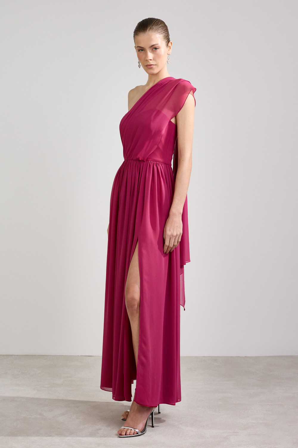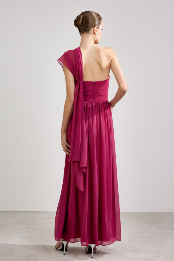 Vestido longo de chiffon com modelagem de um ombro só, apresentando um design fluido e elegante.