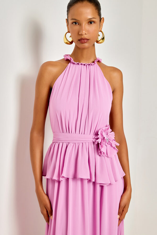 Sua modelagem acinturada se abre em uma linda saia fluida. Confeccionado em tecido de chiffon, é perfeito para casamentos e eventos de gala.