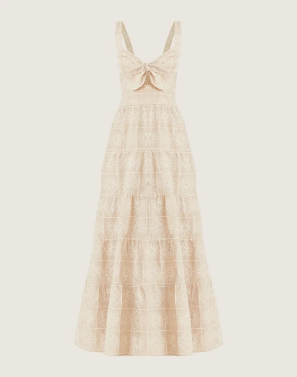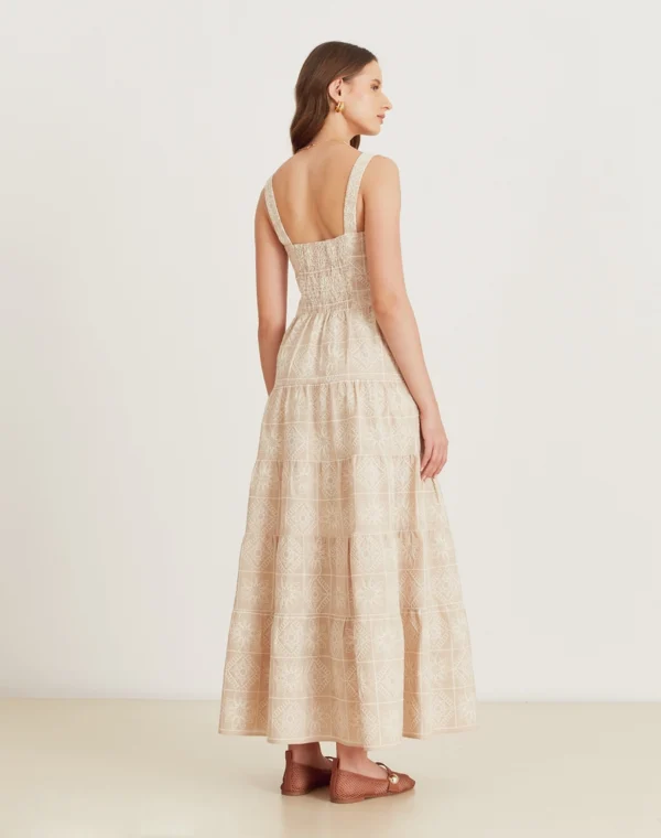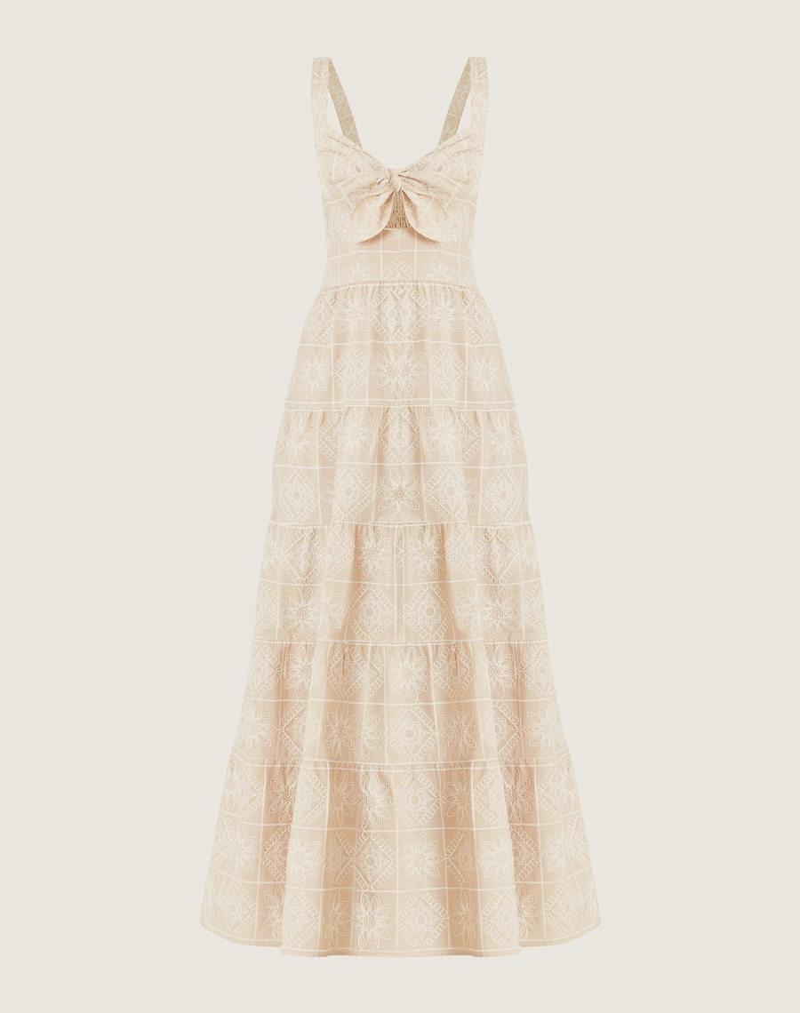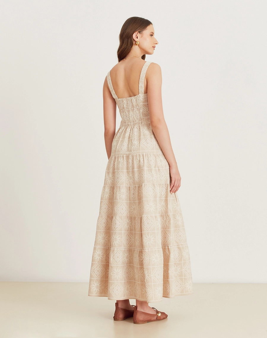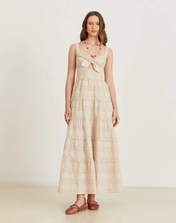 Os bordados geométricos e florais adicionam delicadeza à peça, tornando esse vestido midi bordado perfeito para quem busca um look leve e elegante. Ideal para brunches, batizados, piqueniques ou eventos diurnos.