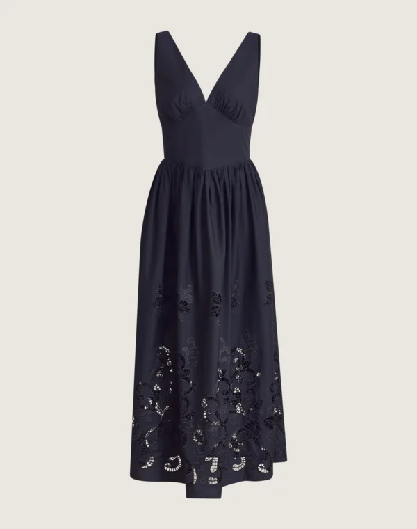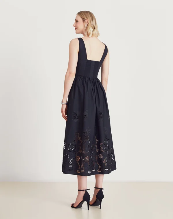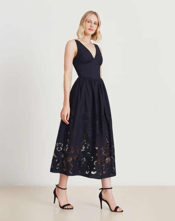 Os bordados vazados na barra e comprimento conferem um toque artesanal e sofisticado à peça, tornando esse vestido midi ideal para transitar entre ocasiões do dia à noite, como brunches e jantares românticos.