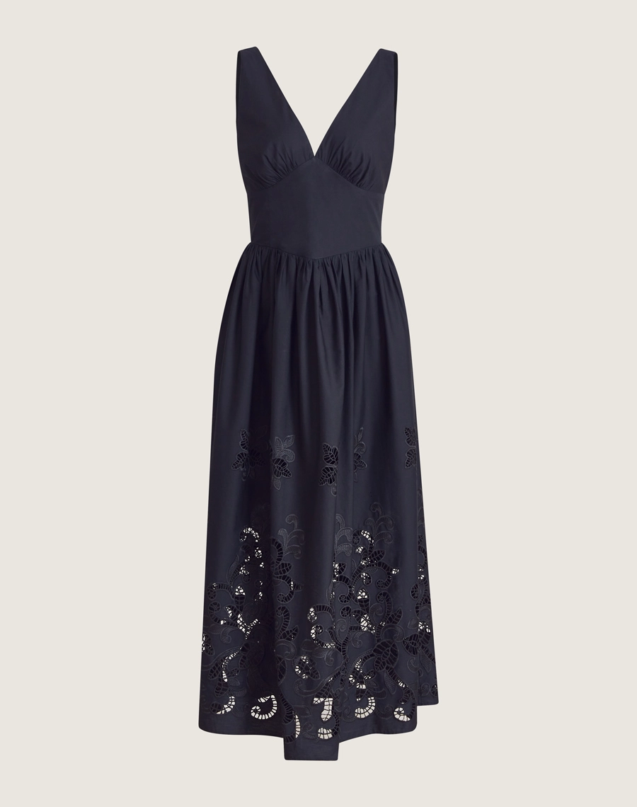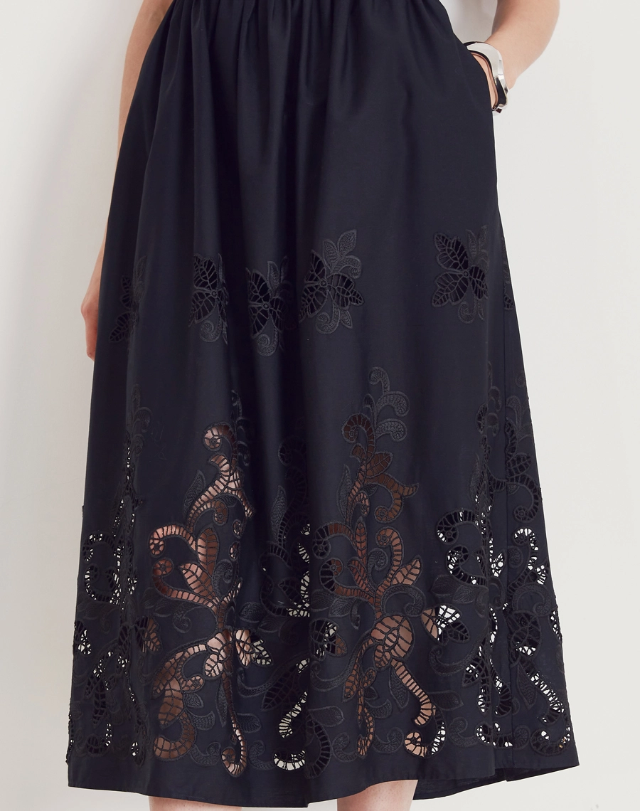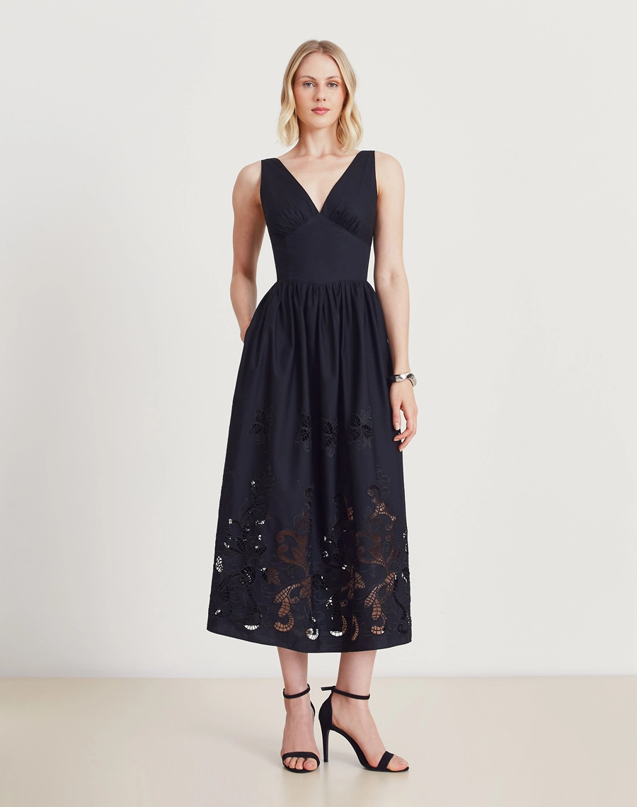 Os bordados vazados na barra e comprimento conferem um toque artesanal e sofisticado à peça, tornando esse vestido midi ideal para transitar entre ocasiões do dia à noite, como brunches e jantares românticos.