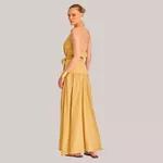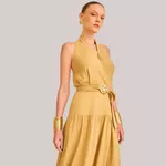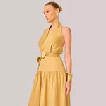 Vestido Midi Visco Linen Zoe. Confeccionado em tecido nobre. O Vestido Midi Zoe é a tradução de elegância moderna com o toque atemporal do linho, todo duplo no mesmo tecido, garantindo caimento perfeito e durabilidade. O modelo frente única traz sensualidade sofisticada, desenhado com cuidado para valorizar a mulher de forma elegante. Acompanha faixa com acessório dourado de acabamento refinado, que acrescenta um detalhe de brilho e sofisticação à produção. Versátil e atemporal, é ideal tanto para uma jovem em um momento especial quanto para a mulher que busca presença e autenticidade no seu dia a dia. Faixa com acessório dourado Frente transpassada Zíper lateral