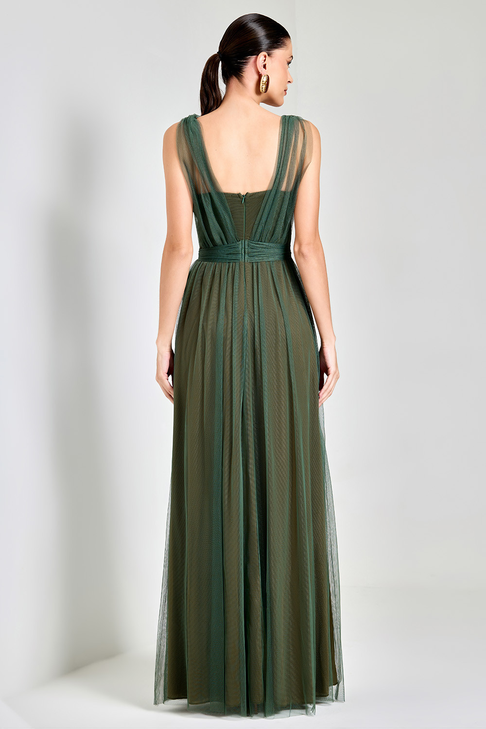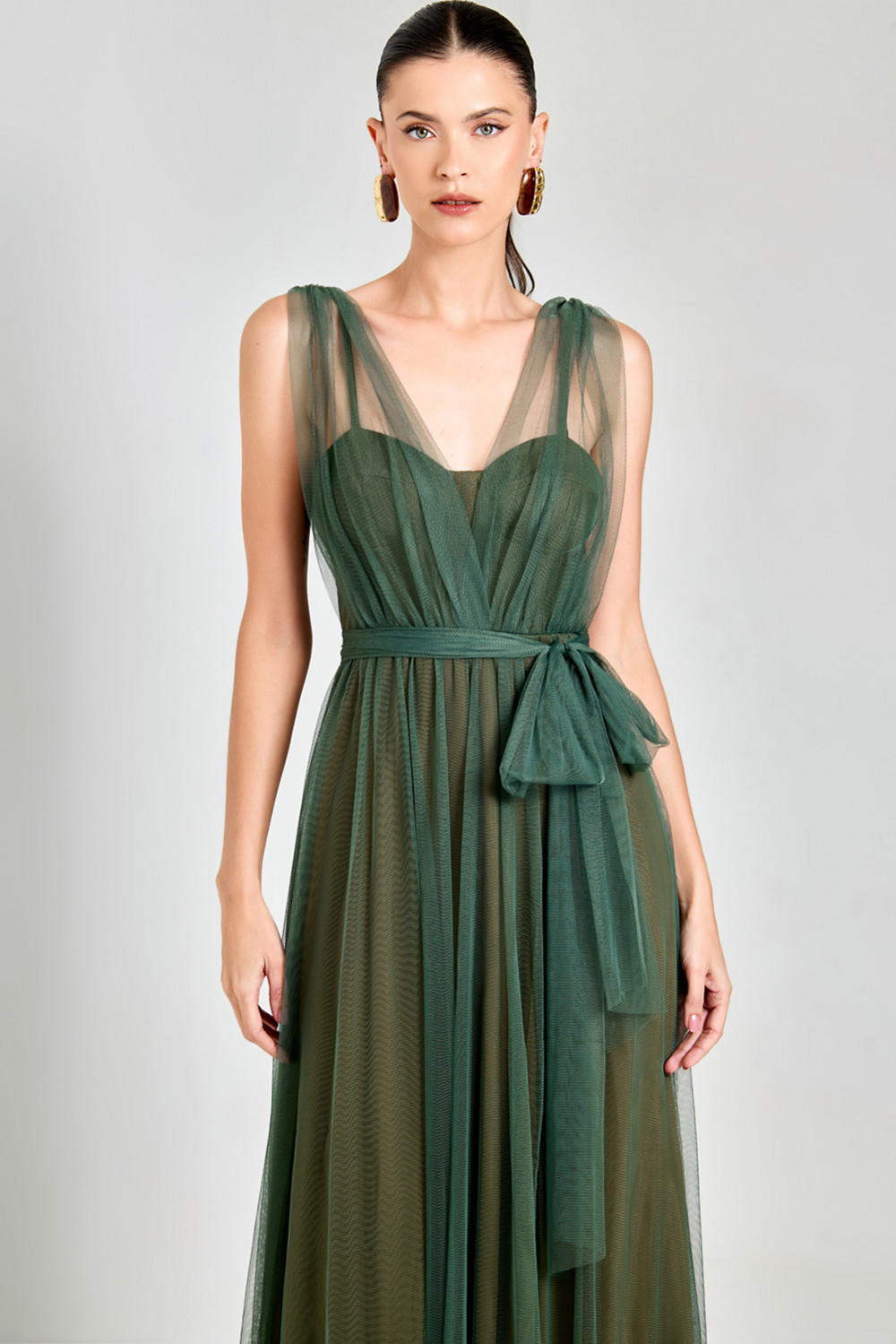 Vestido longo em tule delicado, com corset estruturado embutido e decote coração. A cintura é marcada por uma faixa com laço lateral que transpassa o corpo, enquanto a saia fluída possui leve transparência e fenda frontal, conferindo elegância e movimento. Perfeito para madrinhas e outras ocasiões especiais.