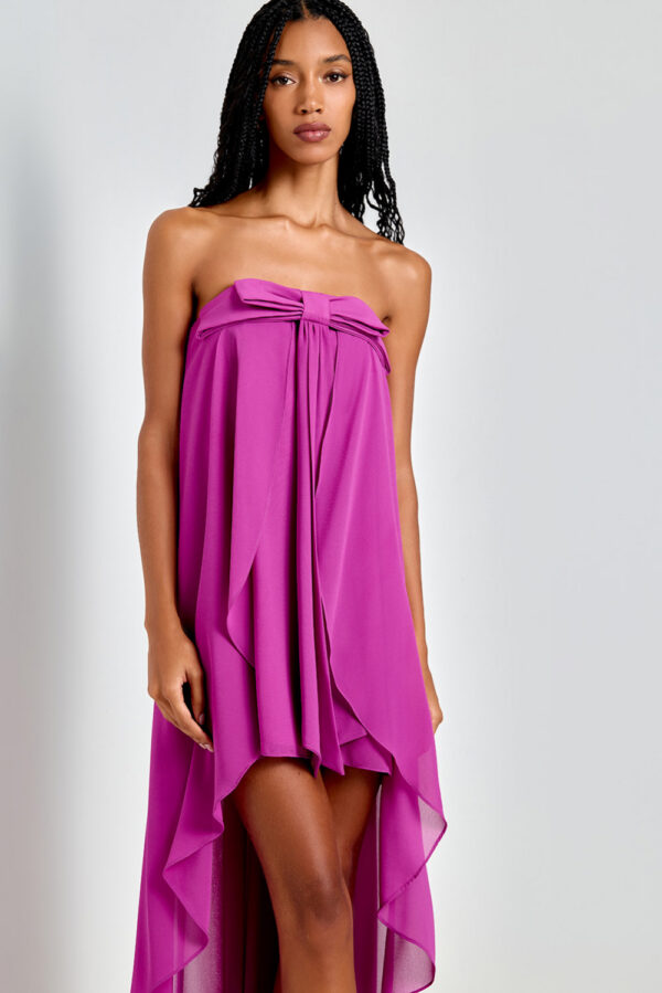 Este vestido é confeccionado em chiffon, com modelagem solta e comprimento mullet, que é curto na frente e longo nas costas. O destaque fica para o decote sem alças adornado por um laço estruturado. Uma peça versátil, perfeita para ocasiões especiais.