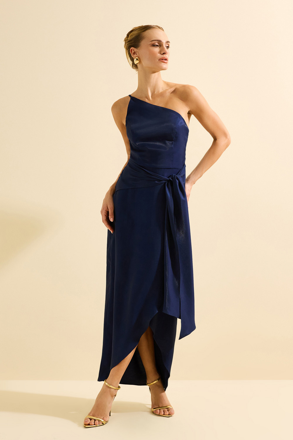 Vestido longoem modelagem de um ombro só, com decote assimétrico. Possui detalhe de faixa do mesmo tecido para amarração na cintura, proporcionando ajuste e valorizando a silhueta. A saia tem corte levemente transpassado, que cria uma fenda frontal discreta.