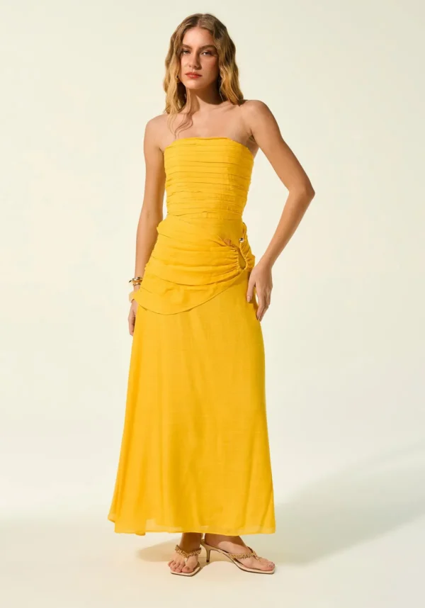 Com drapeado delicado no busto e na parte frontal, a peça valoriza as curvas com sutileza e charme. O detalhe lateral adiciona um toque moderno e elegante, tornando o look ainda mais marcante, laxtex nas costas e fechamento por zíper.