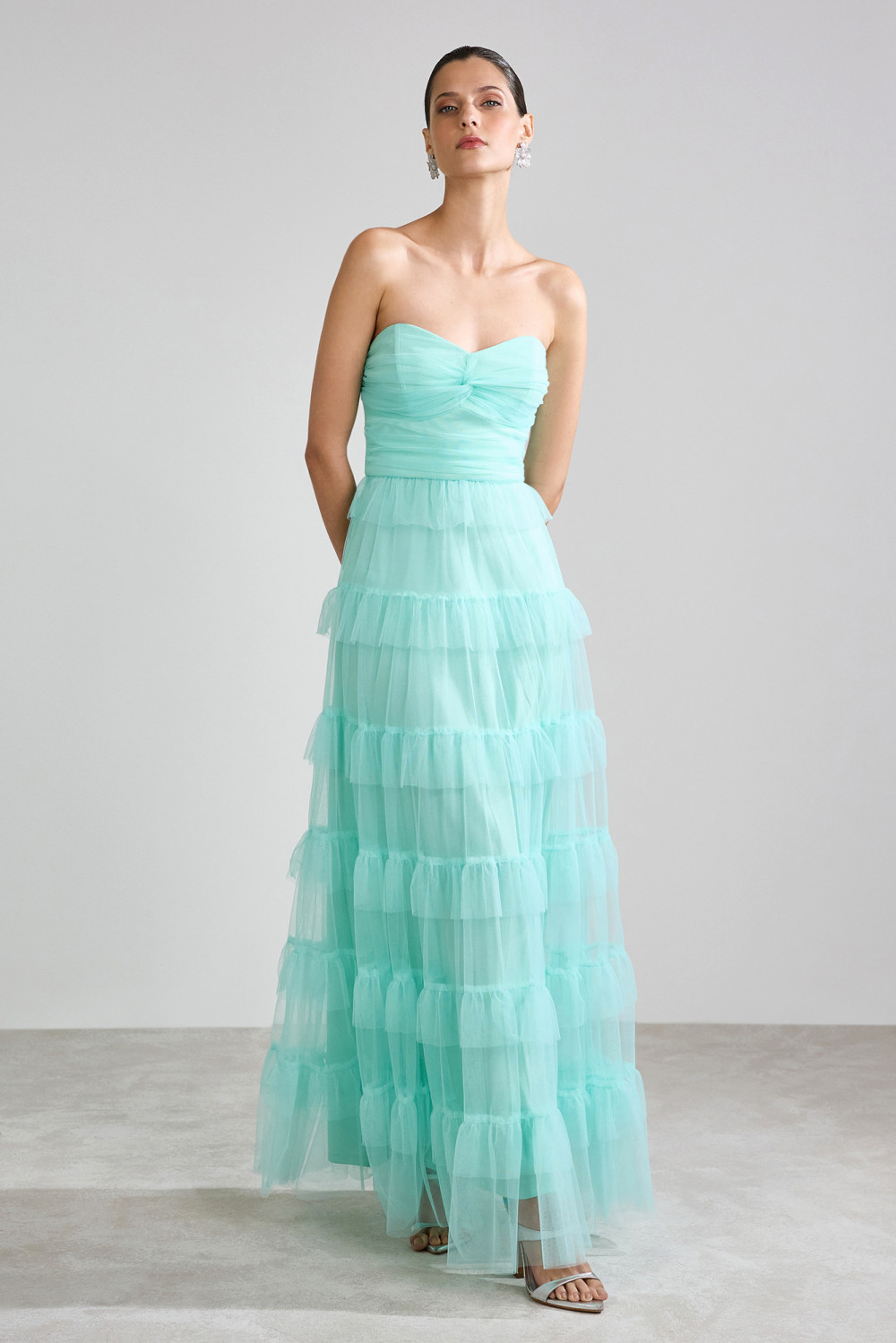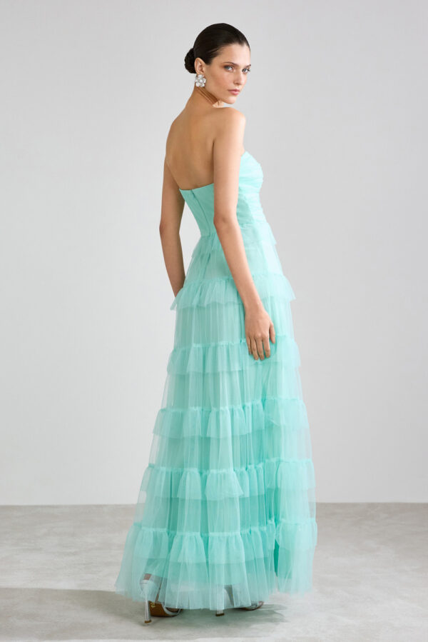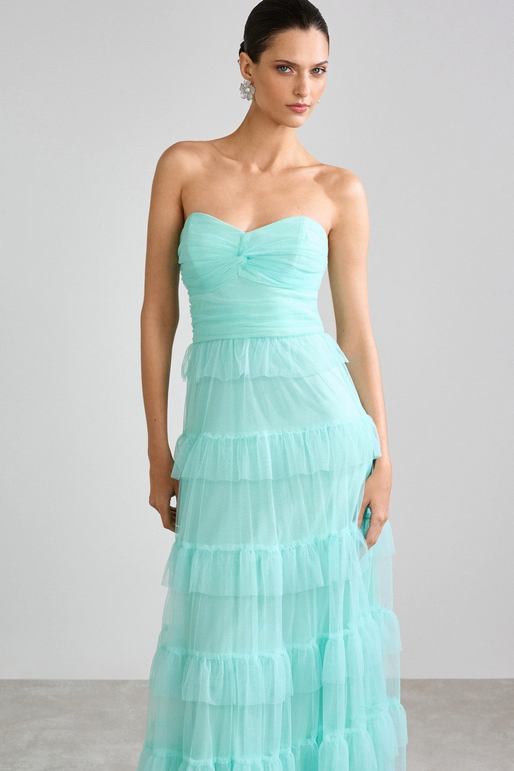 Este vestido longo tomara que caia em tule traz um visual romântico e elegante. Na frente, o busto apresenta drapeado suave que valoriza o colo, enquanto o corpo do vestido é composto por camadas horizontais de babados em tule, que criam movimento e leveza. O shape é fluido e delicado, ideal para ocasiões especiais como festas e eventos ao ar livre. Na parte de trás, o fechamento é por zíper invisível centralizado, garantindo um caimento ajustado ao corpo. As camadas de tule seguem até a barra, mantendo o visual etéreo e sofisticado de todos os ângulos. Uma peça statement para quem quer brilhar com feminilidade e presença..
