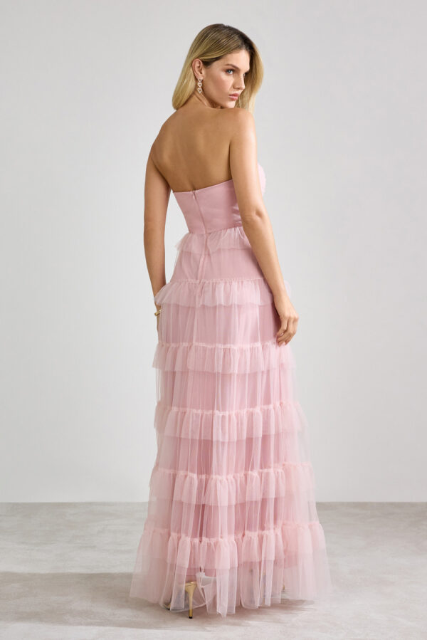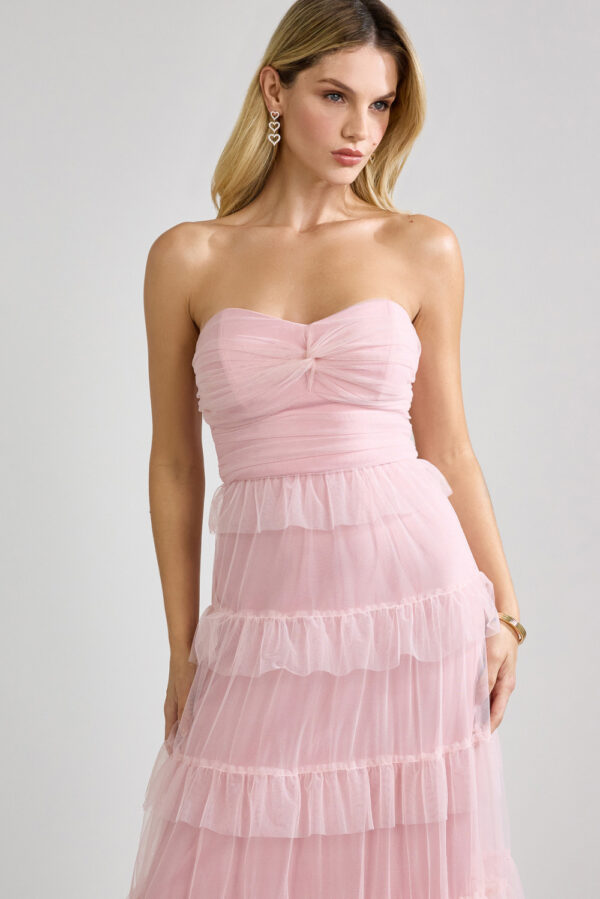 Este vestido longo tomara que caia em tule traz um visual romântico e elegante. Na frente, o busto apresenta drapeado suave que valoriza o colo, enquanto o corpo do vestido é composto por camadas horizontais de babados em tule, que criam movimento e leveza. O shape é fluido e delicado, ideal para ocasiões especiais como festas e eventos ao ar livre. Na parte de trás, o fechamento é por zíper invisível centralizado, garantindo um caimento ajustado ao corpo. As camadas de tule seguem até a barra, mantendo o visual etéreo e sofisticado de todos os ângulos. Uma peça statement para quem quer brilhar com feminilidade e presença..