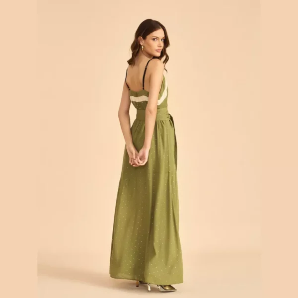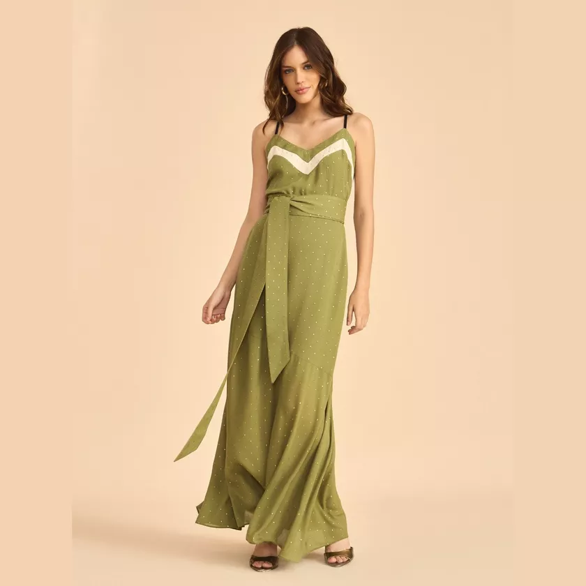 O destaque está no decote em “V”, adornado com um delicado detalhe do mesmo tecido em tom bege, que contrasta sutilmente com a peça. As alças finas na cor preta com reguladores permitem um ajuste perfeito, enquanto o fechamento traseiro em zíper invisível garante praticidade e um acabamento impecável. Acompanha um cinto faixa do mesmo tecido, que pode ser usado para marcar a cintura e criar diferentes propostas de styling. Ideal para ocasiões que pedem elegância com um toque moderno, esse vestido é uma escolha versátil e atemporal. Longo Fluido Alças finas Regulador Recortes Acompanha cinto faixa